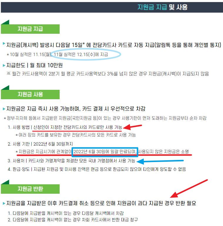 ※ 당연한 이야기지만, 지원금이 오늘 충전된 다음 지원금산정대상이 된 지난달 결제가 취소되면 그만큼 과지급된 지원금은 다음달에 카드사에서 청구합니다. (1월에는 나올 지원금이 없으므로, 11월 결제분 중 결제취소된 것이 있다면 그걸 다시 계산해 회수될 지원금차액은 1월 청구서에 추가된다는 이야기)