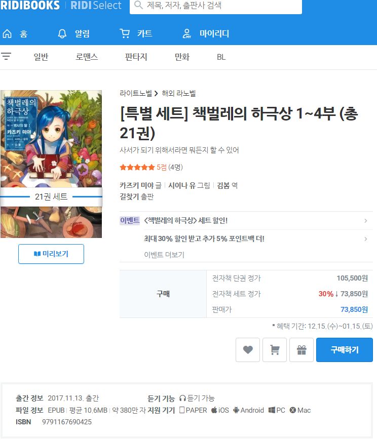 1부 1권부터 4부 9권까지 총 21권으로, 73850원이라고 하니까, 전자책 권당 약 3500원꼴이군요. 다른 서점에서 전자책을 한 권씩 구매할 때는 보통 정가 5000원에 500원 쿠폰을 먹이는 정도로 샀다고 기억하니까, 한 번에 사겠다면 잘 나온 값입니다.