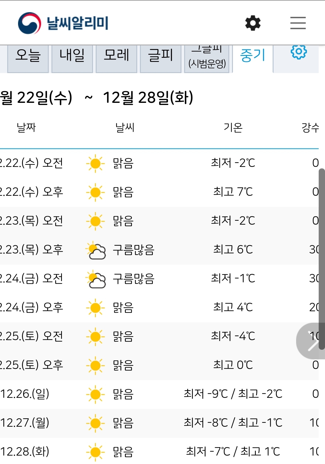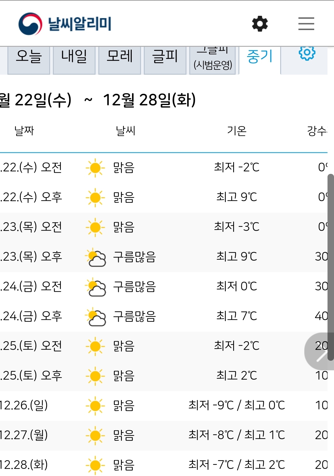 중기예보는 이삼일 지난 뒤에 보면 확 달라져있을 수 있어요. 중요한 일정이 있으면 그때그때 확인하세요