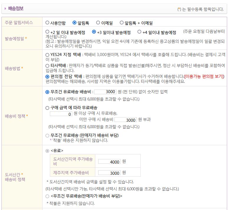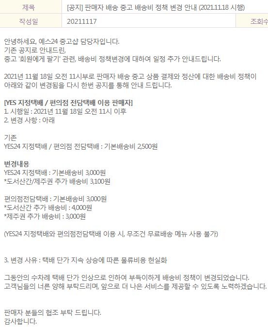 배송비정책은 판매자가 바꿀 수 있는데, 일단 YES24.COM의 공식정책이 바뀐 만큼 2500원으로 적혀 있던 부분이, 지금 조회하니 3000원으로 자동으로 바뀌어있기는 하네요(그때 제 상품은 2500원 책정돼있던 것 같은데, 신경써서 안 봐서 잘 모르겠습니다. 착각일수도.). 값이 정해져있는 편의점전담택배라서인 듯.