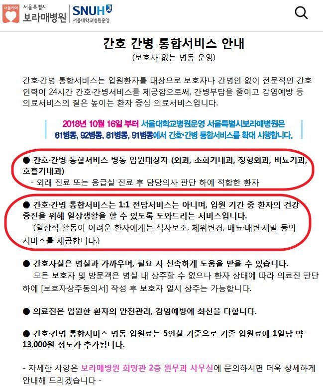 물론 간병인수준으로 옆에서 봐주는 건 '절대' 아니고, 환자심부름이나 요구를 일일이 들어주는 것도 아닙니다(그래서 이걸 간병인제도비슷한 것이라고 오해한 환자들이 언성을 높이거나, 간호간병통합서비스로 감당이 안 되는 환자가 들어오기도 한다네요. 만약 필요해서 관심이 생겼다면 병원에 잘 물어보셔야 합니다). 환자 여럿을 관리하는 데 일반병실보다 더 신경써주는 정도며 필수서비스를 해주는 정도같습니다.