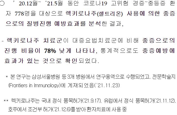 ★ 항체치료제: 렉키로나주(셀트리온) 가 효과있다는 연구결과입니다. 질병관리청은 재택치료자도 필요하다고 의사가 판단한 경우 지정된 의료기관 외래진료나 다른 경로를 통해 항체치료를 받을 수 있도록 한 적 있습니다. 이 약은 본래 입원환자의 중증진행을 막고 중환자의 치사율을 낮추는 용도로 승인되었다지만, 먹는 약이 보급되기 전까지는 도음이 될 것 같네요.