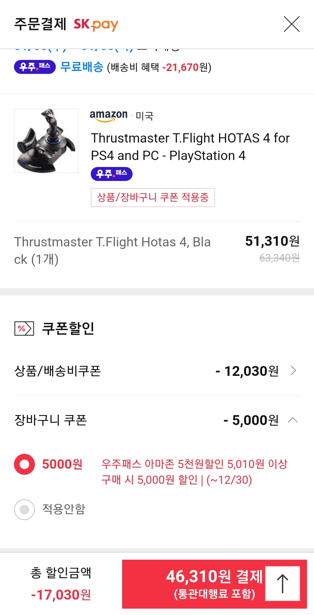 그리고 우주패스 5천원할인 장바구니쿠폰까지 적용하면 약 4.6만원이 됩니다.