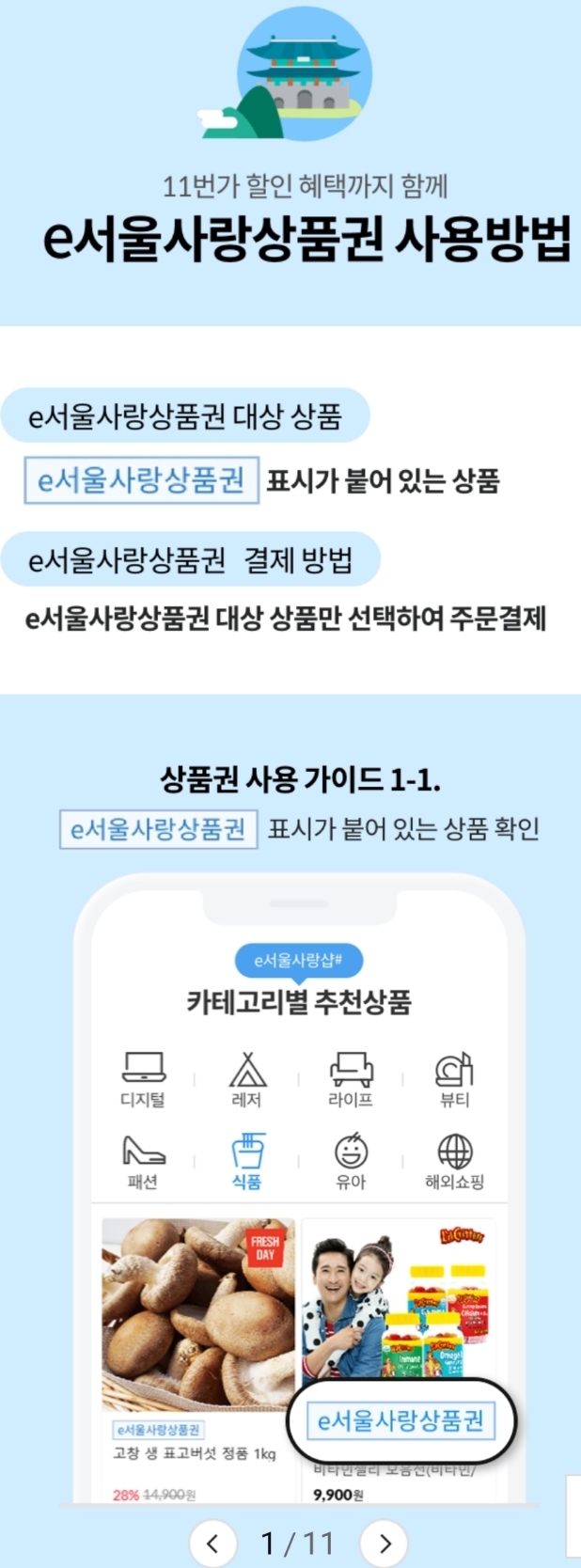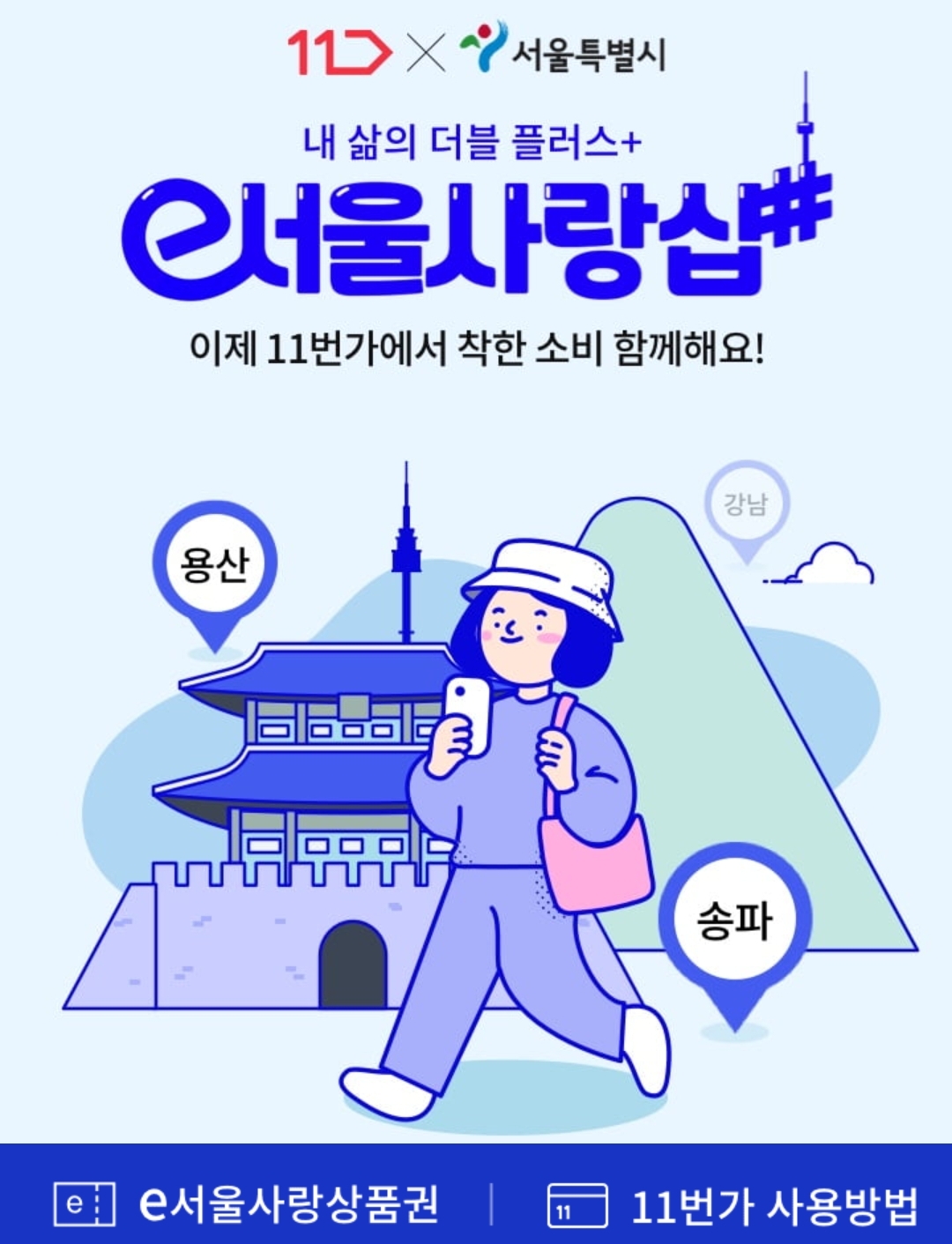 11번가 몰에서 홍보하는데, 온라인 서울사랑상품의 한 종류입니다. 얼핏 봐서는 11번가 등 오픈마켓에서 서울사랑상품권을 받을 수 있는 판매자의 상품을 구매하고 결제할 수 있는 것 같습니다.