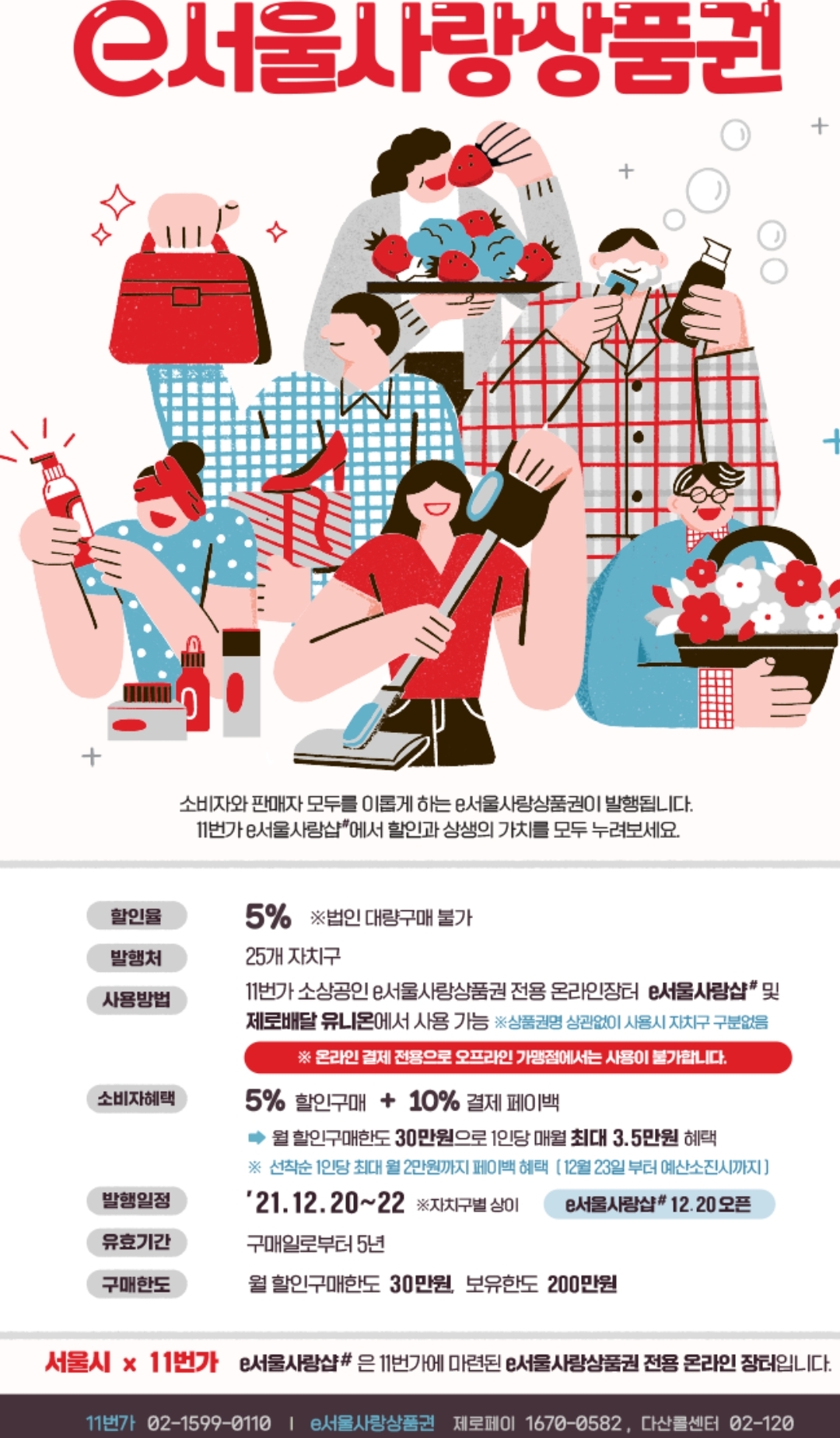 11번가 소상공인 e서울사랑상품권 전용 온라인장터 및 e서울사랑샵# 및 제로배달 유니온에서 사용 가능한 e서울사랑상품권이 12월 20일(월)부터 발행됩니다.