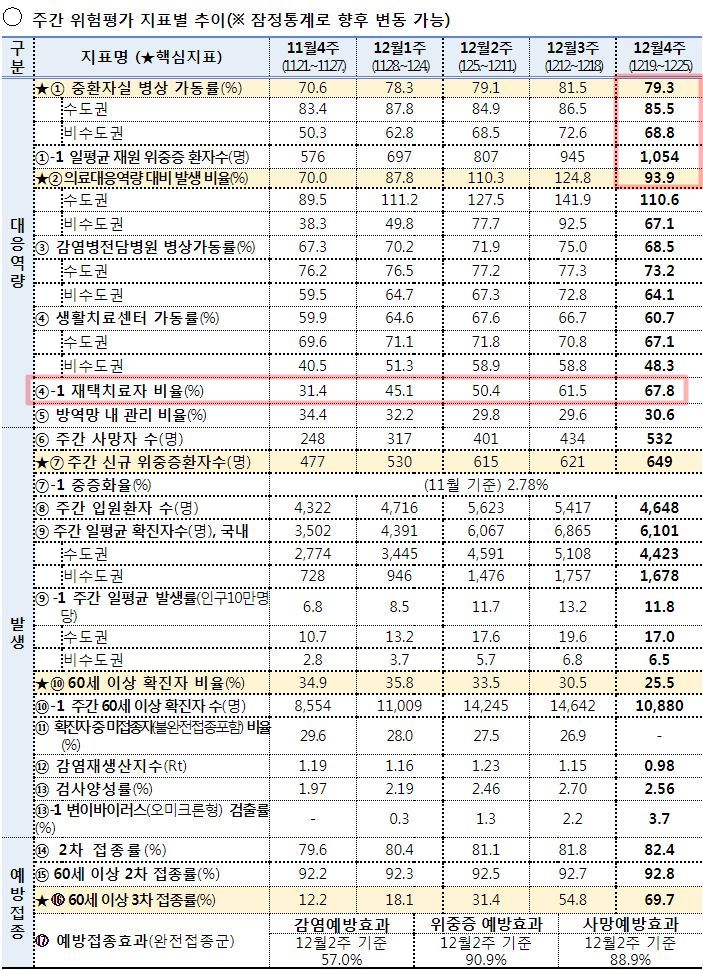 병상대기하던 환자 사망, 중환자실에서 나가라 명령받은 중환자 사망.. 이런 사례가 줄줄이 보도되는 마당인데 통계상으로는 "의료대응역량대비 발생율"이 아직 100%의 아래네요? 헛웃음이 나오는 숫자입니다. 아, 지난 두 주간은 100%가 넘었다고 표시되어있기는 하네요. 재택치료자 비율은 거의 70%에 육박합니다. 이것은 어떻게 계산한 것일까요.