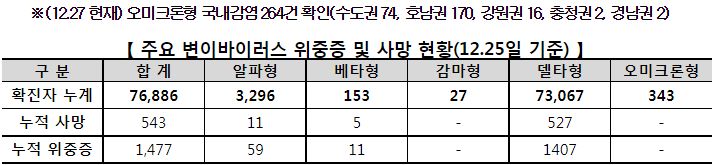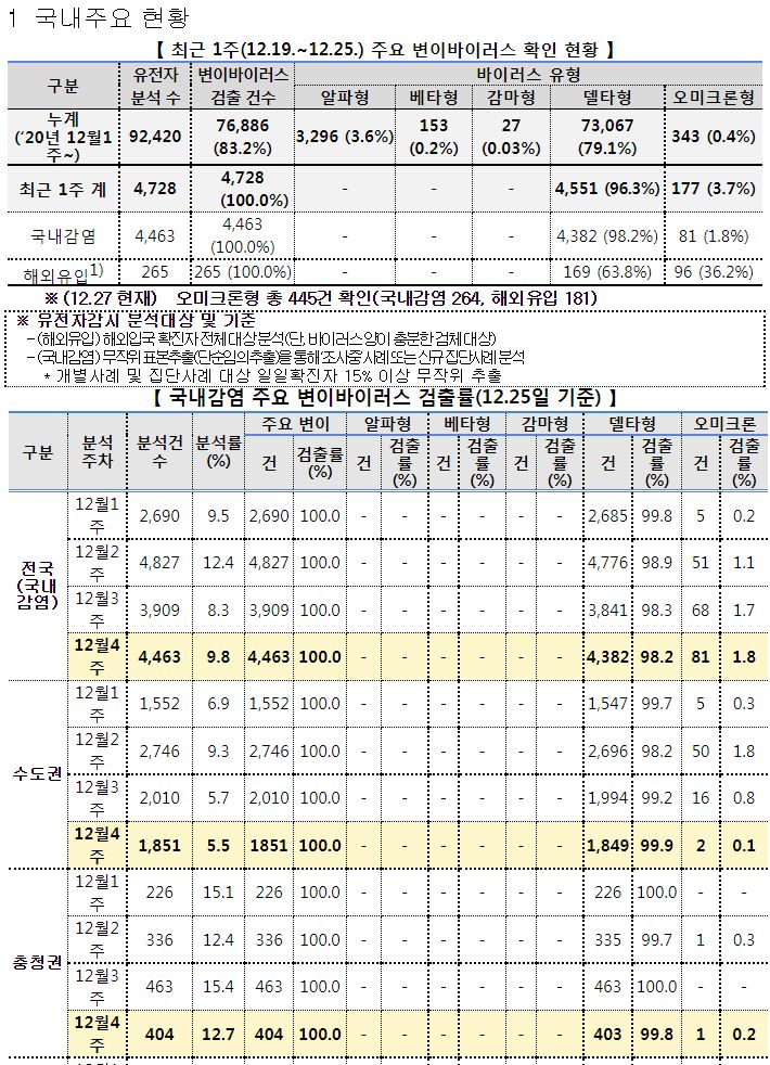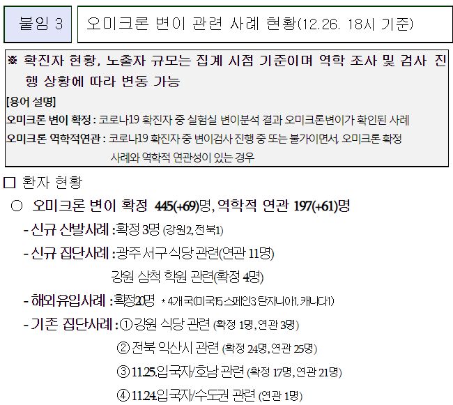 | 코로나19, 오미크론변이 국내현황(2021.12.24)/:/ 오미크론변이 판별 키트 30일부터 현장 사용 (0) | 2021.12.25 |