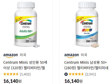 (11번가-아마존) 센트룸(Centrum) Minis 50+ 성인용 320정(160일분), 남성용 280정(140일분) (~9500원/우주패스) 본문