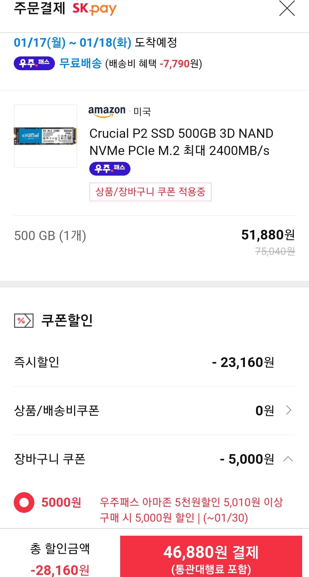 할인은 우주패스 장바구니 5천원쿠폰.