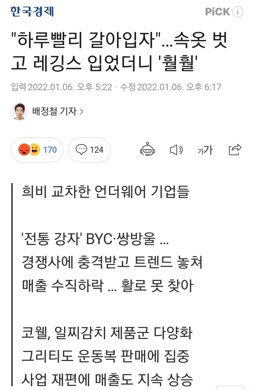 ‘속옷만 고집하다가는 고사한다.’ 2010년대 유니클로 ‘히트텍’ 공습으로 어려움을 겪은 국내 속옷업체들이 여전히 활로 찾기에 부심하고 있다. 내복, 언더웨어 등 속옷 의존도가 높은 BYC와