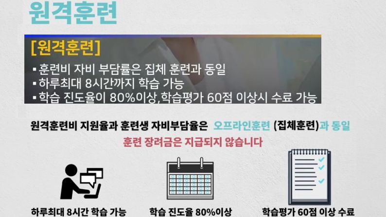 원격훈련은 수강신청부터 수료까지 온라인교육으로 이루어지는 과정. (자세한 부분은 알아보지 않았으니 확인필요)