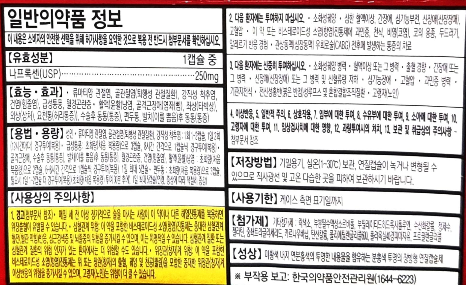 이 종류의 나프록센약은 비스테로이드성 소염진통제 중 효과가 오래가고 부작용이 적은 편이며, 처방없이 먹을 수 있는 일반의약품 중 강한 편이라고. 하지만 비스테로이드성 소염진통제(프로스타글란딘 기전 차단)의 일반적인 단점 및 주의점이 공통적으로 있고, 다른 약과 마찬가지로 일일 용량제한이 있어 과용하거나 '마치 비타민먹듯' 오랫동안 먹으면 안 좋다. 특히 이미 치료받고 있는 병하고 상관있어 먹는 것이면 반드시 의사와 상담할 것.