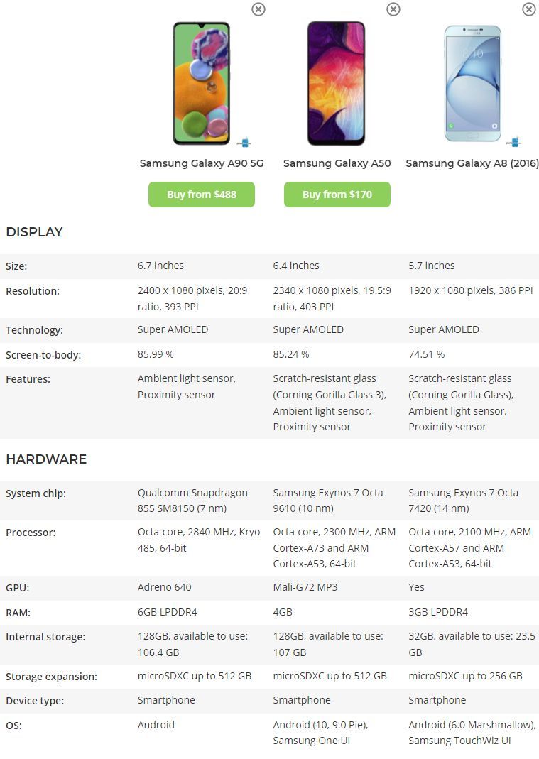 갤럭시 A90 5G(2019), 갤럭시 A50(2019), 갤럭시 A8(2016) 크기 사양 비교표 본문
