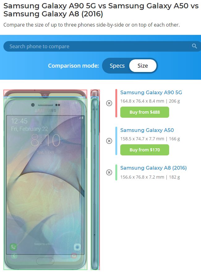 갤럭시 A90 5G(2019), 갤럭시 A50(2019), 갤럭시 A8(2016) 크기 사양 비교표 본문