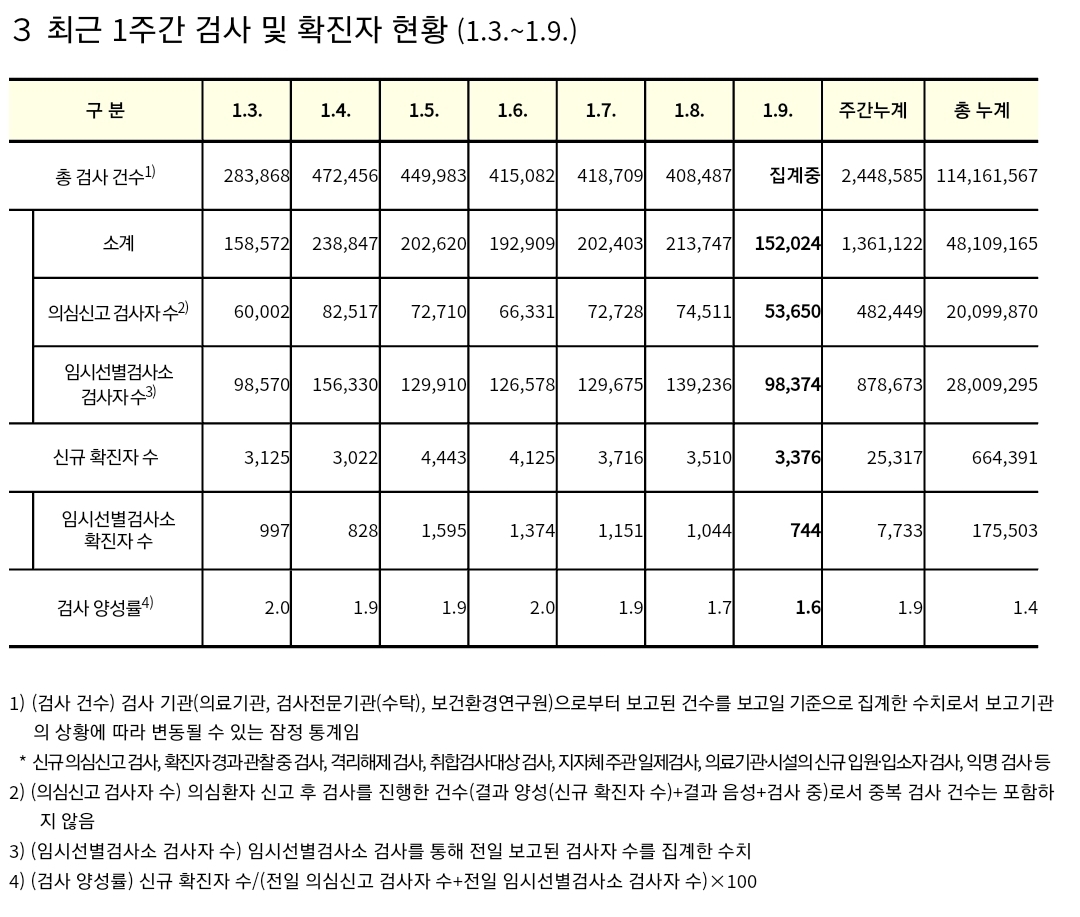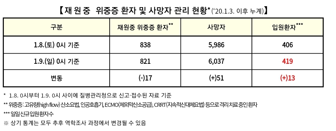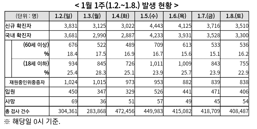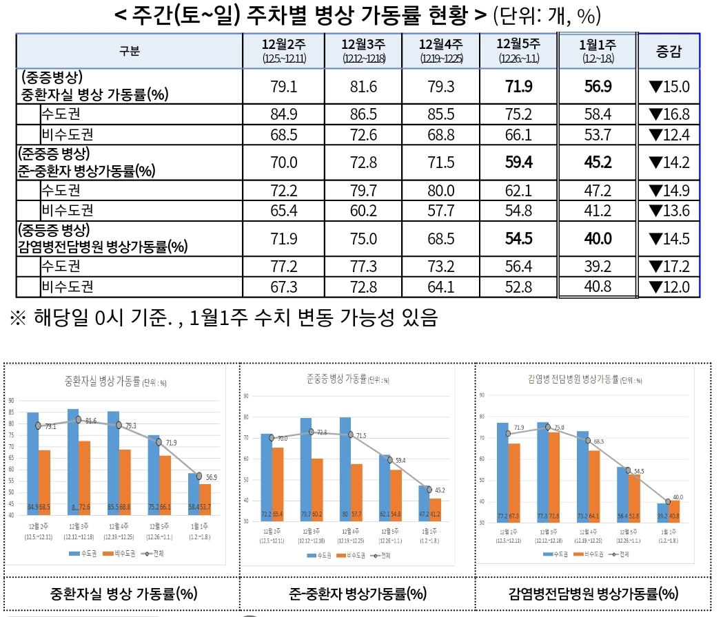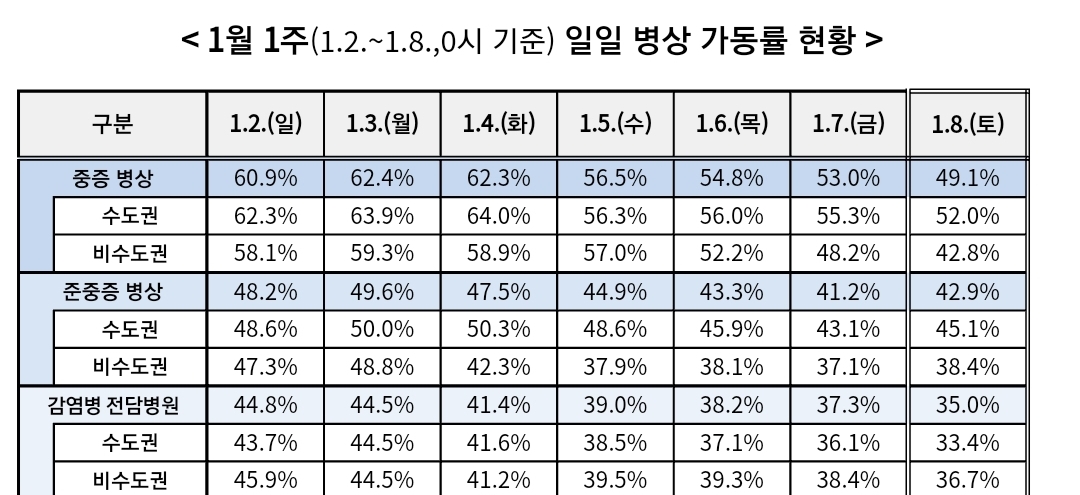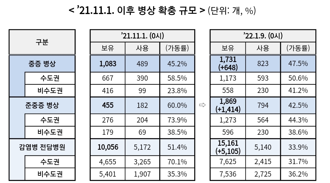 코로나19집계(2022.1.9. 0시기준): 3376명/:/ 주간 병상운용 등 본문