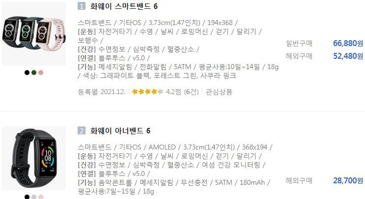 이 스마트밴드는 원래 화웨이의 아너(Honor)브랜드에 속했다가 화웨이가 그걸 팔며 분리됐다고 한다. 다나와에서 스마트밴드분류로 들어가 제조사필터 화웨이를 켜면, 올해 하반기 국내출시된 것으로 스마트밴드6라는 항목이 보인다. 이것에 대응하는 중국내수품은 아너밴드6인 것 같은데, 직구품은 국내A/S가 안 되고 UI가 좀 다르다(정발품은 "한글화 100%"라고 광고를붙여놓기는 했다)는 말이 있다. 하지만 UI나 기능이 뭐가 어떻게 다른지는 사용기를 검색해보는 게 좋겠다. 내수와 정발품의 가격차는 꽤 난다.