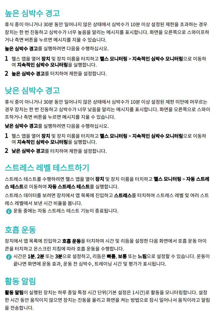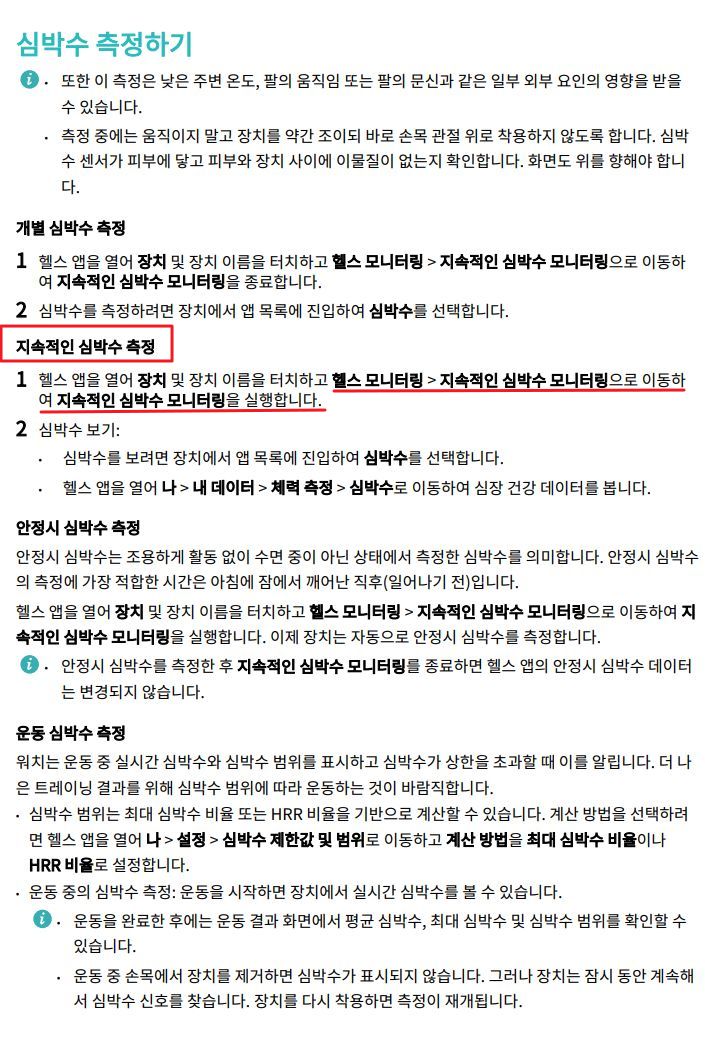 ㅡ "지속적인 심박수 측정"이라는 항목이 있어 24시간내내 상시 심박수 측정이 가능한 모양이다. 맥박을 재는 센서가 있는 스마트밴드는 배터리만 충분하거나 유선으로 전력을 공급할 수 있으면 이게 가능하다.
