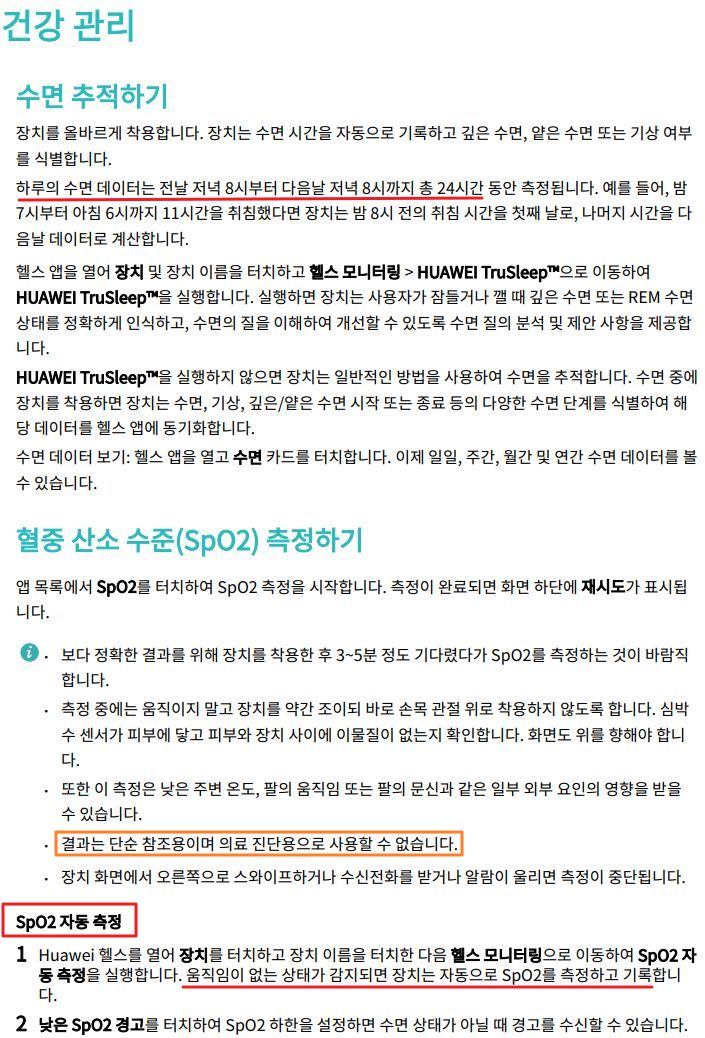 ㅡ "SpO2 자동 측정"이라는 기능으로 산소포화도를 지속적으로 기록할 수 있다는 모양인데, "움직임이 없는 상태가 감지되면 기록"이라고 하는데, 24시간기록세팅가능한지 아니면 저렇게만 기록가능한지 모르겠다. 그런데, 화웨이의 영문판 제품소개를 보면 "All-day SpO2 Monitoring. (......) HUAWEI Band 6 has a built-in SpO2 detection system that monitors your blood oxygen saturation 24/7" 이라며 광고를 하고 있다. 사용기를 봐야 할 수 있을 것 같다. 하지만 검색되는 건 출시 보도자료뿐(직구품과 정발품 다나와의 쇼핑몰 상품리뷰를 봤는데, 후기가 몇 개 안 될 뿐더러 마치 외국인이 번역기로 써붙인 문장같아 웃음이 나왔다). 샤오미 미밴드6의 사용기와 쇼핑몰 리뷰목록과는 천지차이다. 그래서 정보부족. 다음에 국어나 영어로 더 찾아봐야 할 듯.