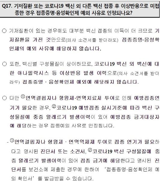 질병청이 열거한 사유말고는, 중한 "기저질환"을 가지고 있더라도 백신을 맞아야 하며, "백신을 맞는 것이 이득이 더 크다"고 말하고 있습니다. 그거야 그렇겠죠. 그런 사람들은 몸이 약하니 걸리게 되면 더 쉽게 죽을 테니까. 그래서 우리나라 만이 아니라 전세계의 보건기관들이 그런 취약집단에게 우선순위를 주어 백신을 맞게 한 것입니다. 그런데 그만큼 백신의 리스크도 크게 진다는 걸 생각하면, 그 중 어떤 사람들은 망설이지 않을 수 없거든요? 예를 들어, 요즘 병상이 없어 큰 병원들이 퇴원을 일찍 시키는데, 수술 후 회복 중인 환자도 저 서류상 기준을 충족하지 않으면 백신을 맞아야 하며, 안 맞으면 방역패스 예외사유로 인정되지 않는다는 거죠, 저거? 그래서 백신맞은 다음에, 만약 통상적인 백신 이상반응(부작용)을 몸이 잘 버티지 못해 다른 부작용을 겪거나 더 나쁜 일을 겪으면, 소위 그 심의라는 걸 열어서 기저질환탓으로 분류할 것인가하는 생각을 하게 됩니다. 취지는 십분 알겠지만, 개인의 사정을 봐가며 선택권까지는 아니라도 3차접종에 유예기간은 더 주어져도 되지 않을까요.
