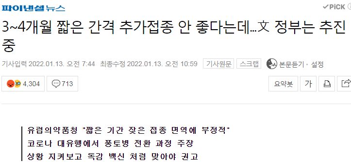 오해를 막기 위해 먼저 적습니다: 지금 하고 있는 3차접종이 아니라 4차접종에 관한 기사라고 보시면 됩니다. 3차접종때 그랬듯이 이것도 다시 당겨질 수도 있고, 그 잘난 사람들의 속사정을 모르니 그냥 그런 말을 요즘 했다 정도만 읽으면 될 것 같습니다.