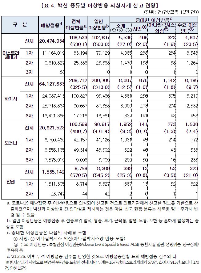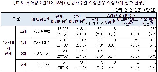 * 중대한 이상반응은 중증, 사망, 아나필락시스 및 주요 이상반응