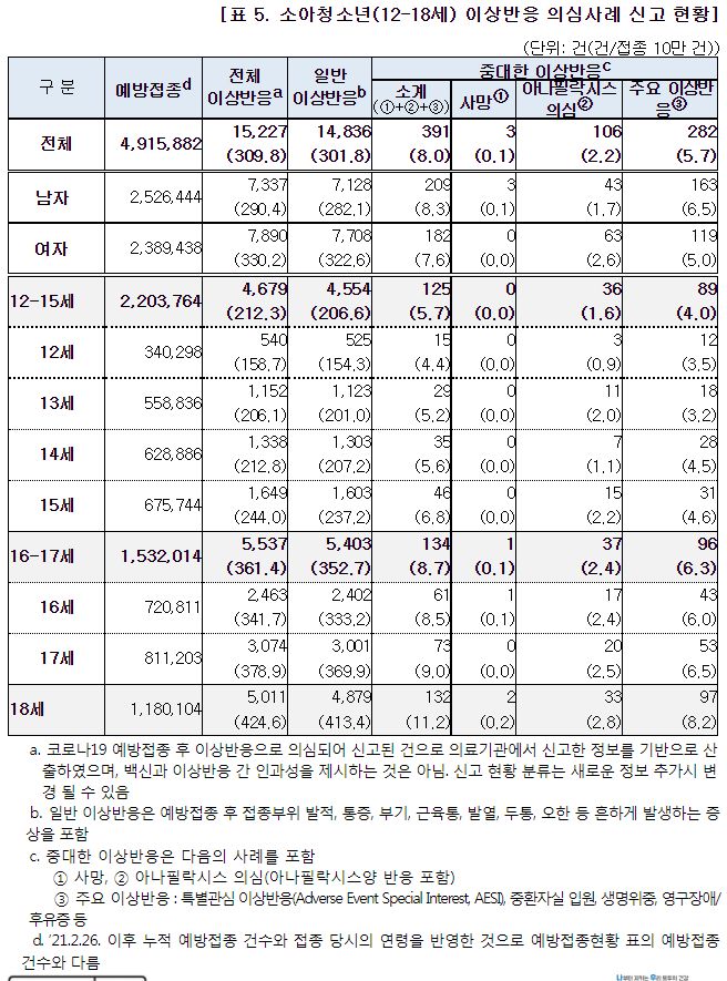 * 이상반응 신고통계는 출생연도 기준 예방접종 건수를 기반으로 산출(인구집단을 기반으로 산출하는 예방접종현황의 예방접종 건수와 다름)