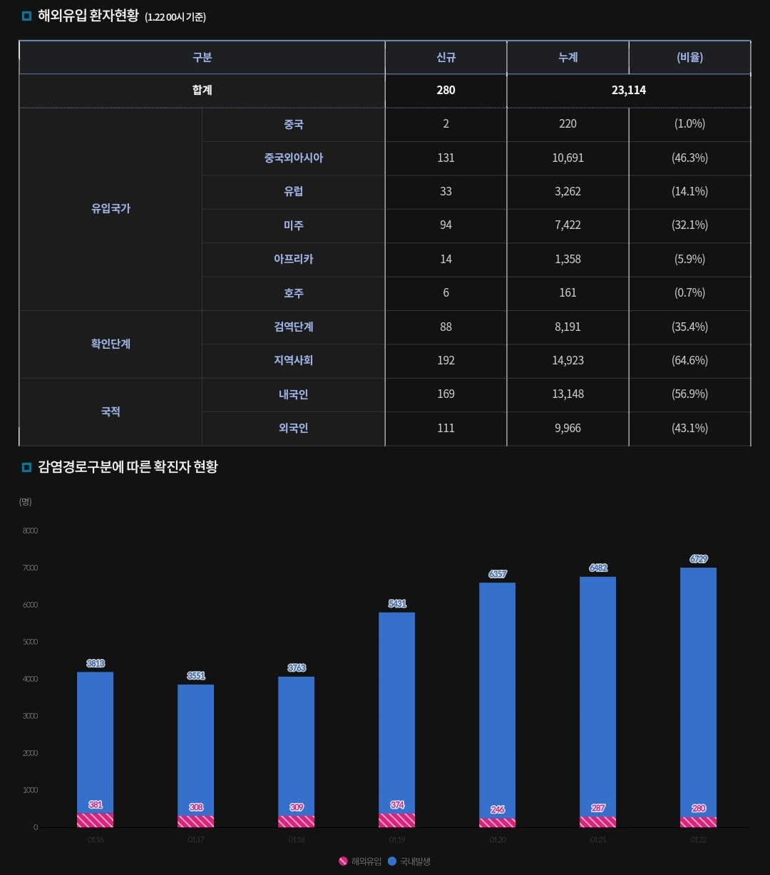 | 코로나19집계(2022.1.23. 0시기준): 7630명 ★ (0) | 2022.01.23 |