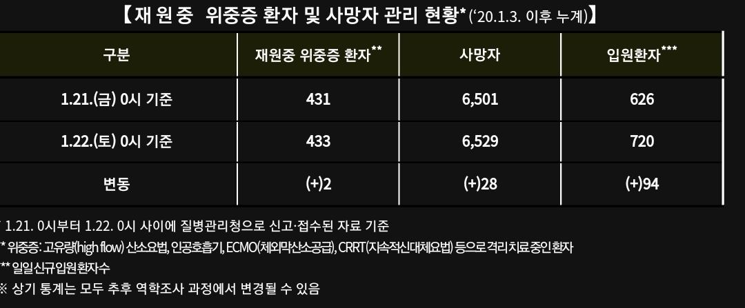 | 코로나19 유행 상황(2022.1.21): 오미크론우세지역 치료정책 변경, 병상확보상황 등 (작성중) (0) | 2022.01.22 |