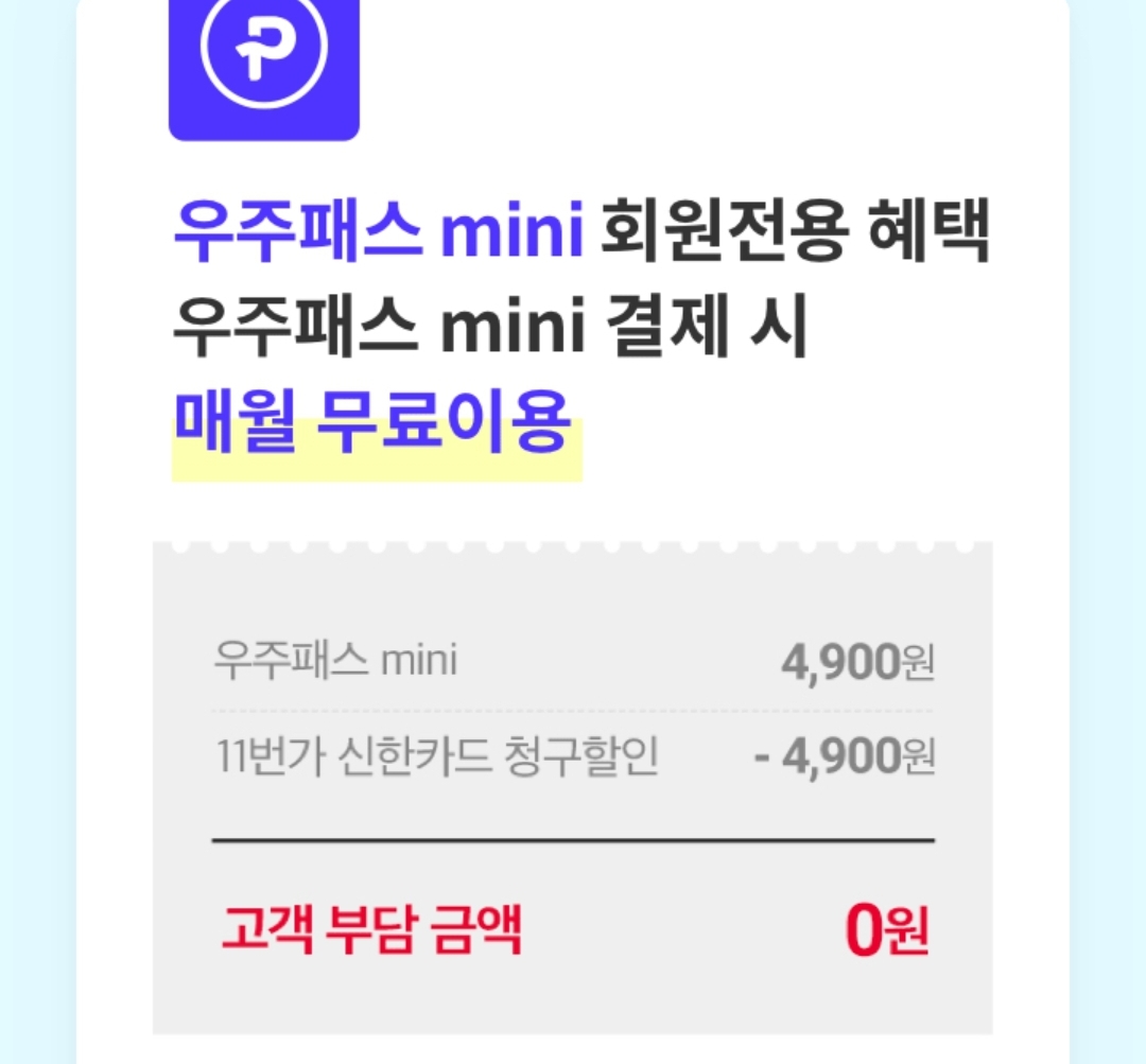 매월 아마존 우주패스 mini 구독요금(1개월단위 결제시 4900원) 결제분을, 청구월 11번가-아마존 카드결제액에서 청구할인해준다고 합니다. 아래 갈무리한 내용을 봐서는 올해 6월 결제분까지만 해당하는 프로모션인 듯.