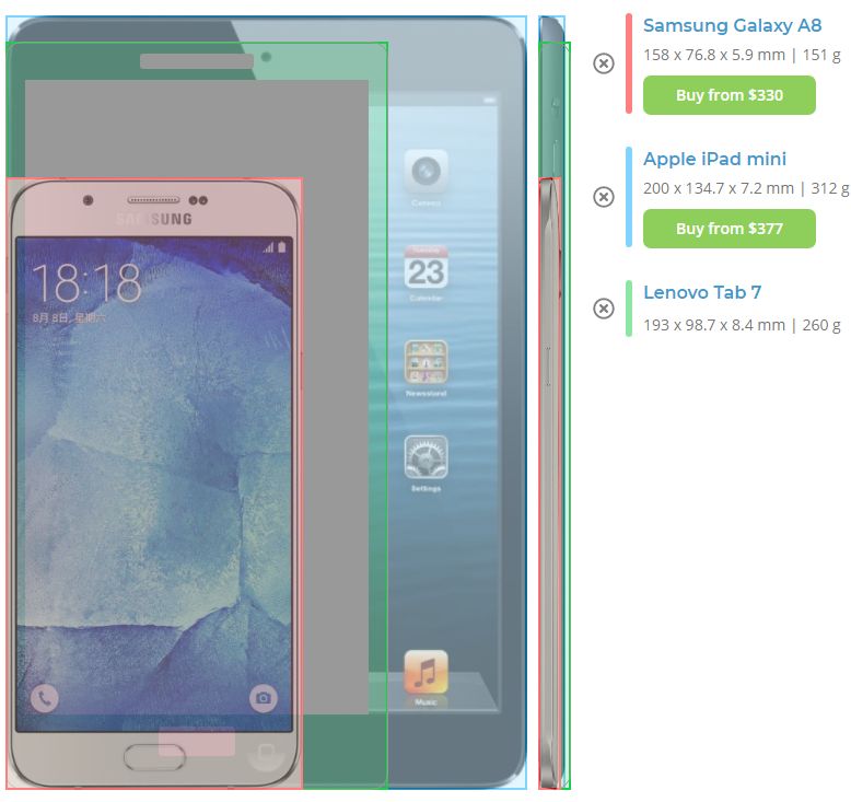 아래는 16:9 5.7인치 화면비율 스마트폰과, 7인치 태블릿, 그리고 4:3비율 아이패드 미니를 비교한 것입니다. 출처는 phonearena.com 레노보탭7은 사진이 아니라 그림이라 좀 그렇지만. 8인치 16:10태블릿은 저것보다 좀 더 넓다고 생각하면 되겠네요.