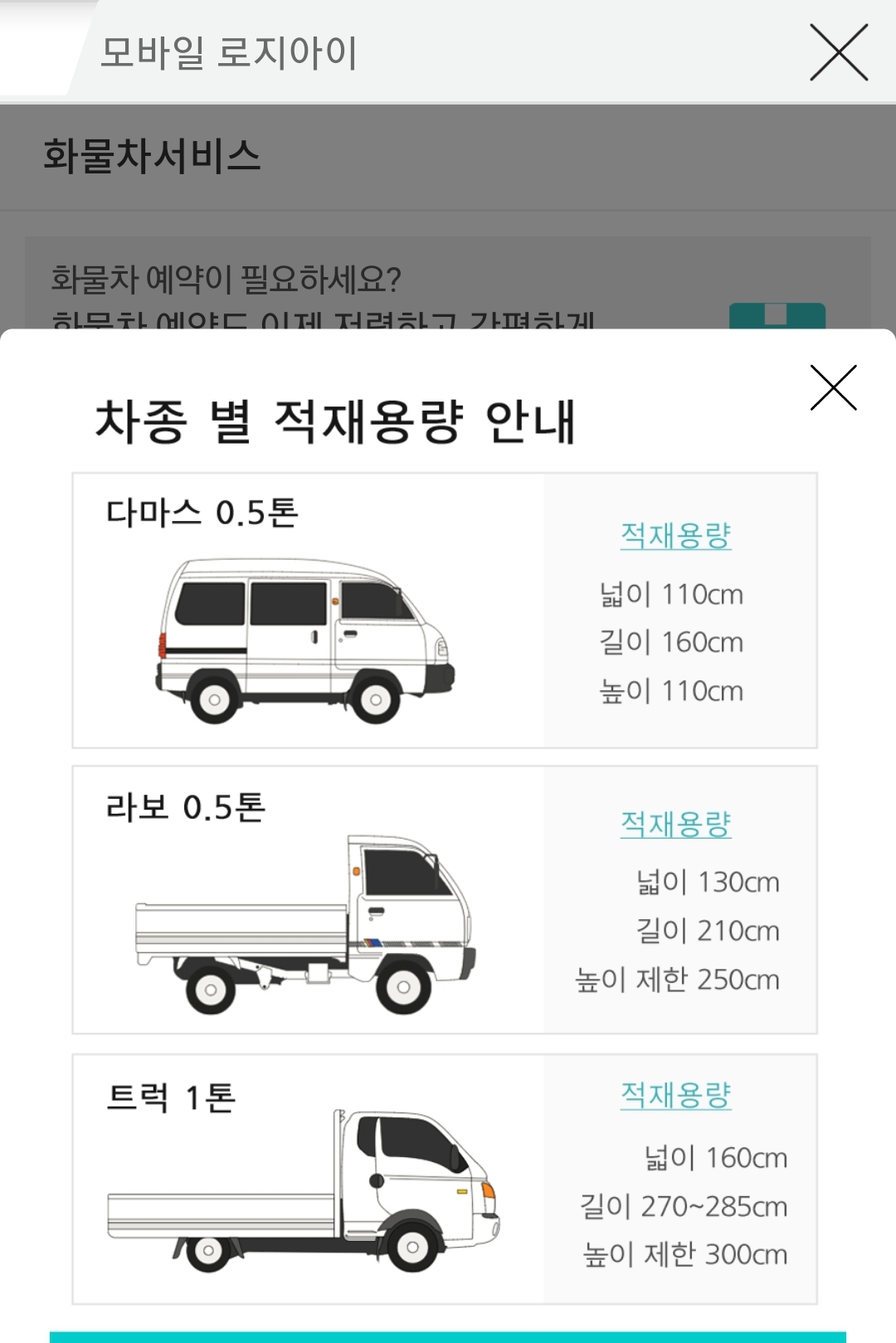 장거리는 상담 후 결정. 표를 보니 기본적으로 50km정도의 근거리를 대상으로 하는 서비스인 듯. 1톤이 최대니 원룸이사? 0.5톤도 있는 걸 보면 요금에 따라서는 대형가전이나 가구운반?3