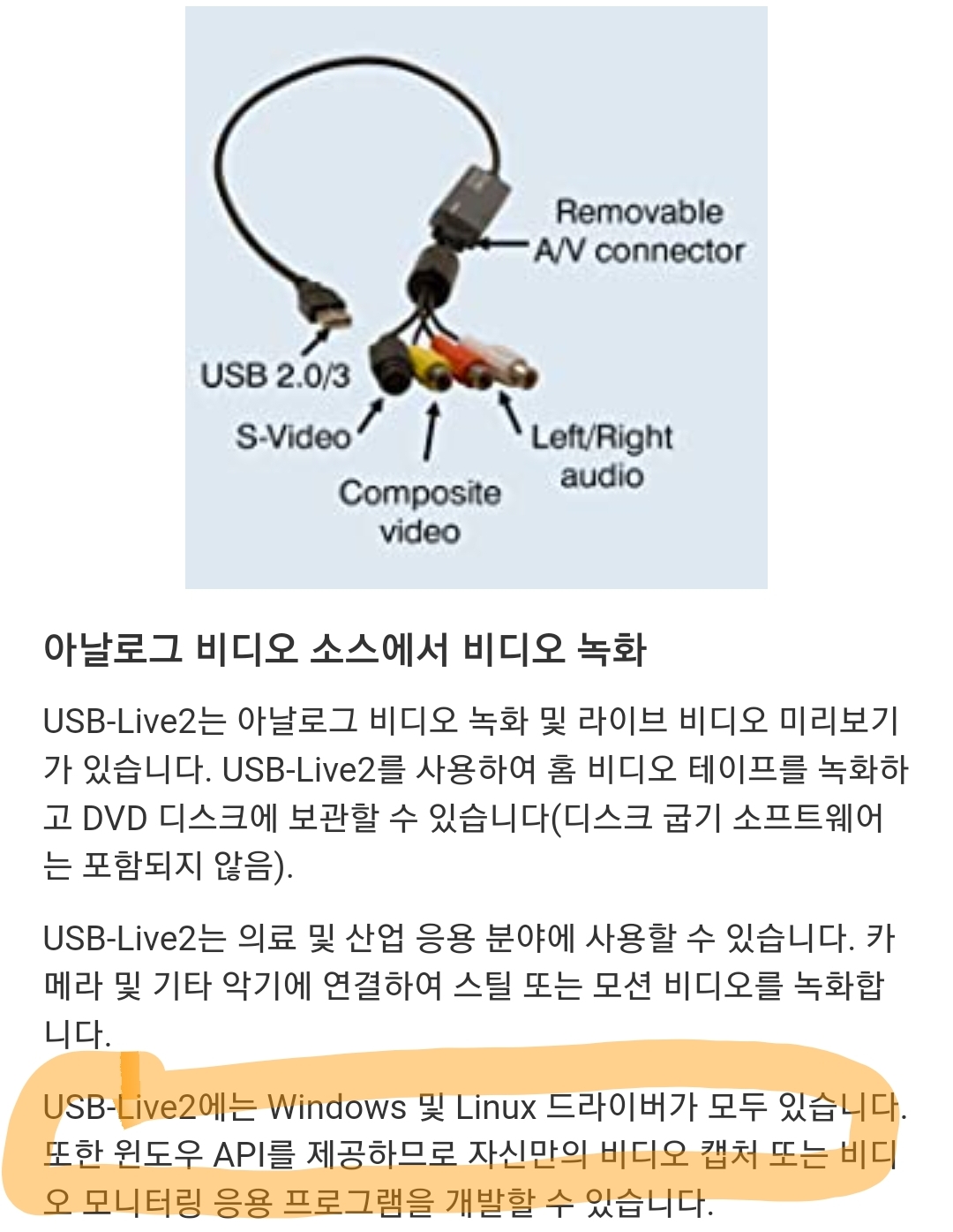 이렇게 생긴 물건을 중국직구로 구하면 1만원 미만에도 살 수 있습니다. 그런데 저 브랜드는 아날로그영상 캡쳐와 TV카드로는 미국에서 업력이 길고 화질도 좋다고 알려진 곳입니다(거의 모든 소비자용 소프트웨어에서 지원하는 영상캡쳐장비 호환목록을 꼽으면 언급되는 정도였습니다). 11번가 아마존에서 혹시 파나 싶어 찾다 보인 게 이거라 기록삼아 올려둡니다.