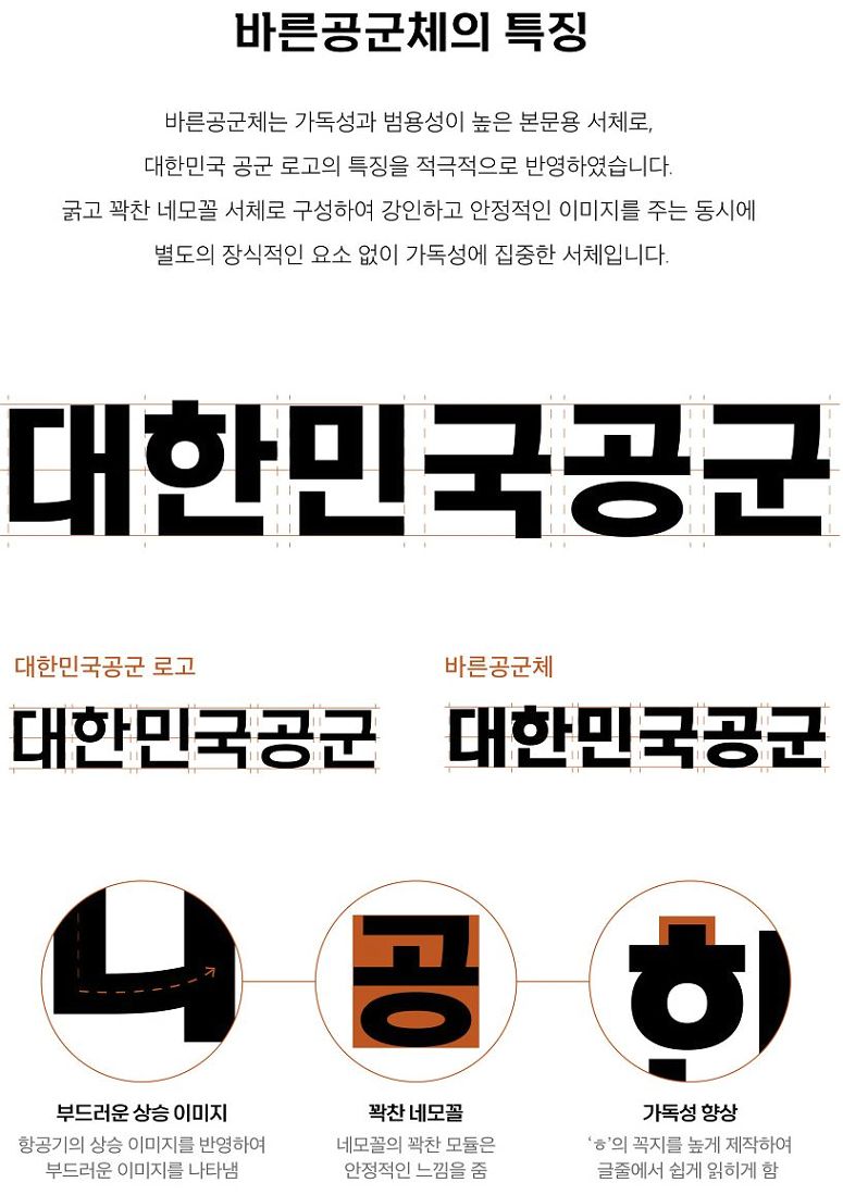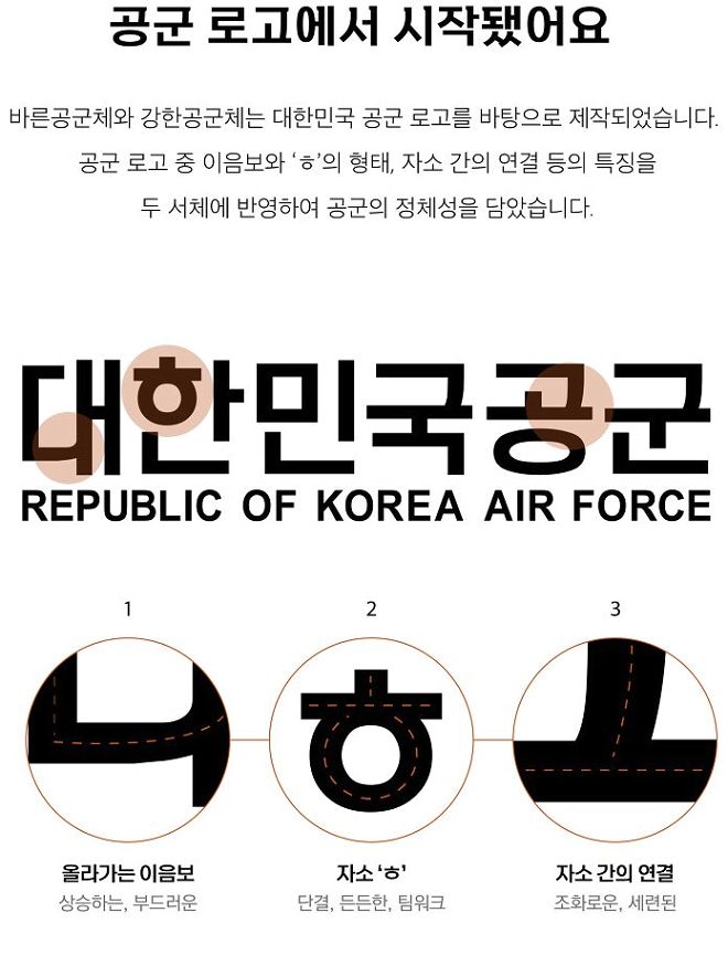 공군을 새롭게 쓰다. 공군 전용서체 바른공군체 / 강한공군체 대한민국공군의 바른공군체, 강한공군체의 지적재산권은 대한민국공군이 소유하고 있습니다. 바른공군체, 강한공군체는 개인 및