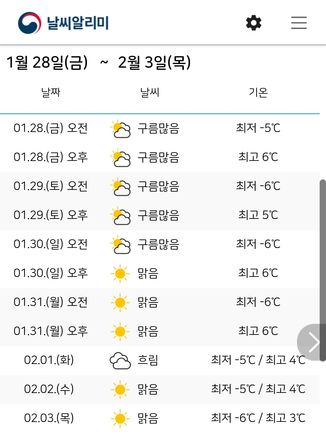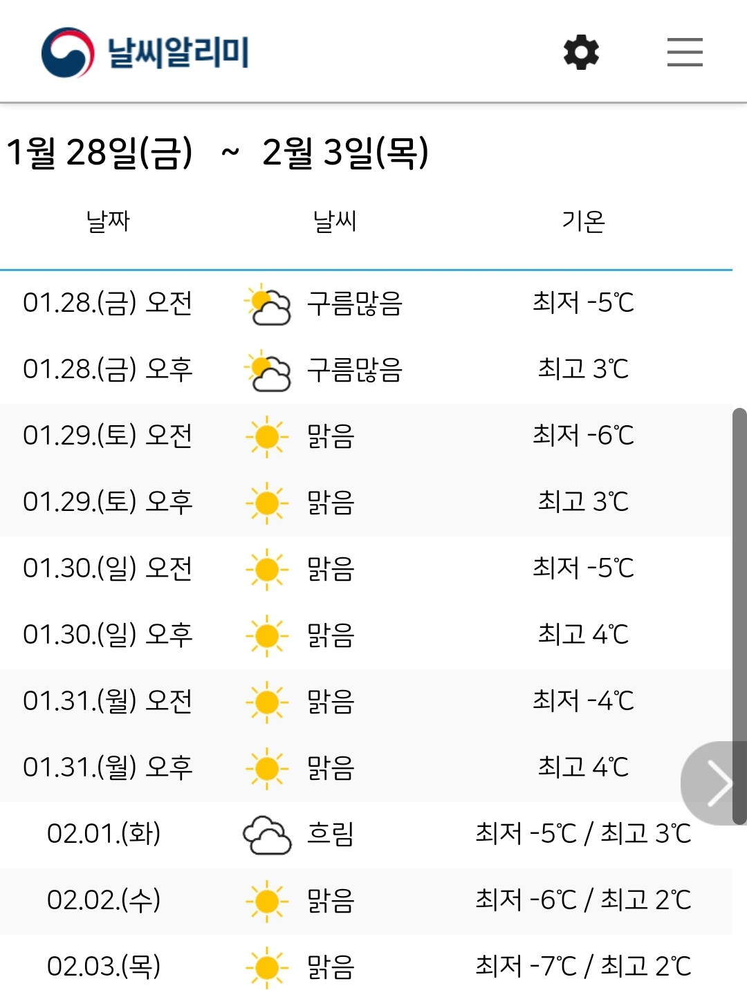 설연휴 대전 기온은 주간 최저 -6도, 최고 6도, 서울은 주간 최저 -7도, 최고 4도. 본문