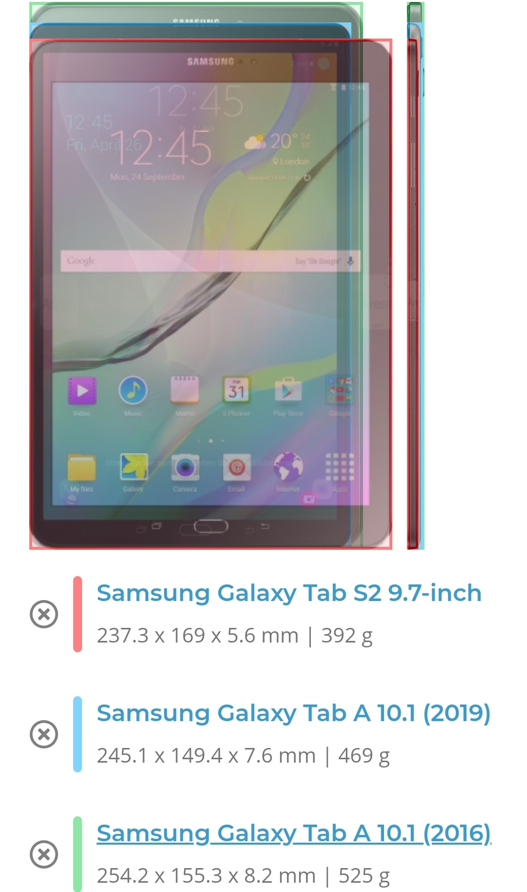 Compare Samsung Galaxy Tab S2 9.7-inch vs Samsung Galaxy Tab A 10.1 (2019) vs Samsung Galaxy Tab A 10.1 (2016) sizes against each other in real-time with our phone size comparison tool.