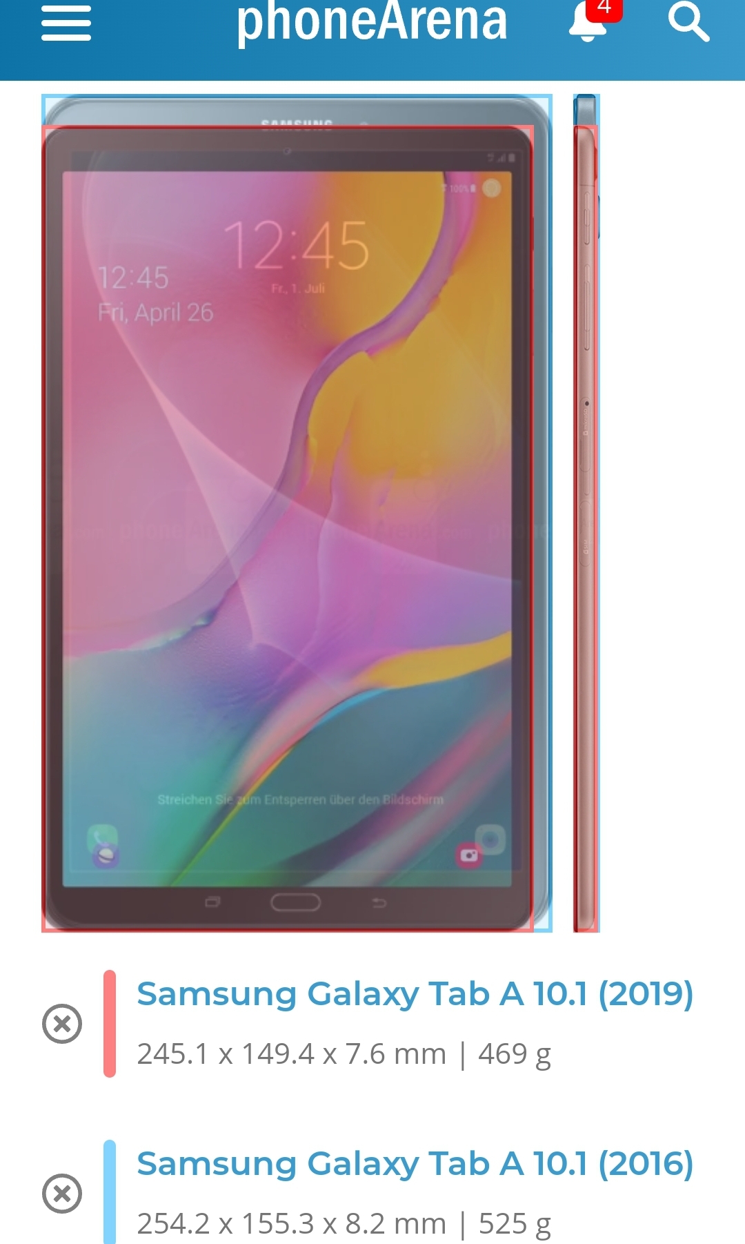 폰아레나닷컴의 이 가상비교가 정확하냐면 의심가기는 한다. 위의 두 번째 화면을 보면, 둘 다 10.1인치 19:10비율 삼성탭이다. 하지만 크기가 다르게 그려져있고, 적었듯이 그림 자체가 다르다.