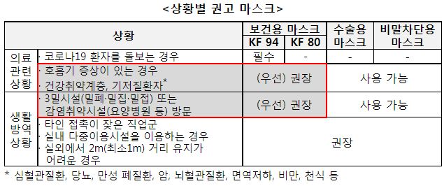 마스크는 KF80, KF94 우선사용. 덴탈마스크는 아직 사용 가능.