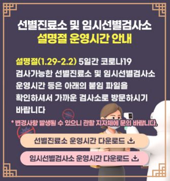 코로나19, 2022년 설명절기간 선별진료소와 임시선별검사소 운영시간 본문