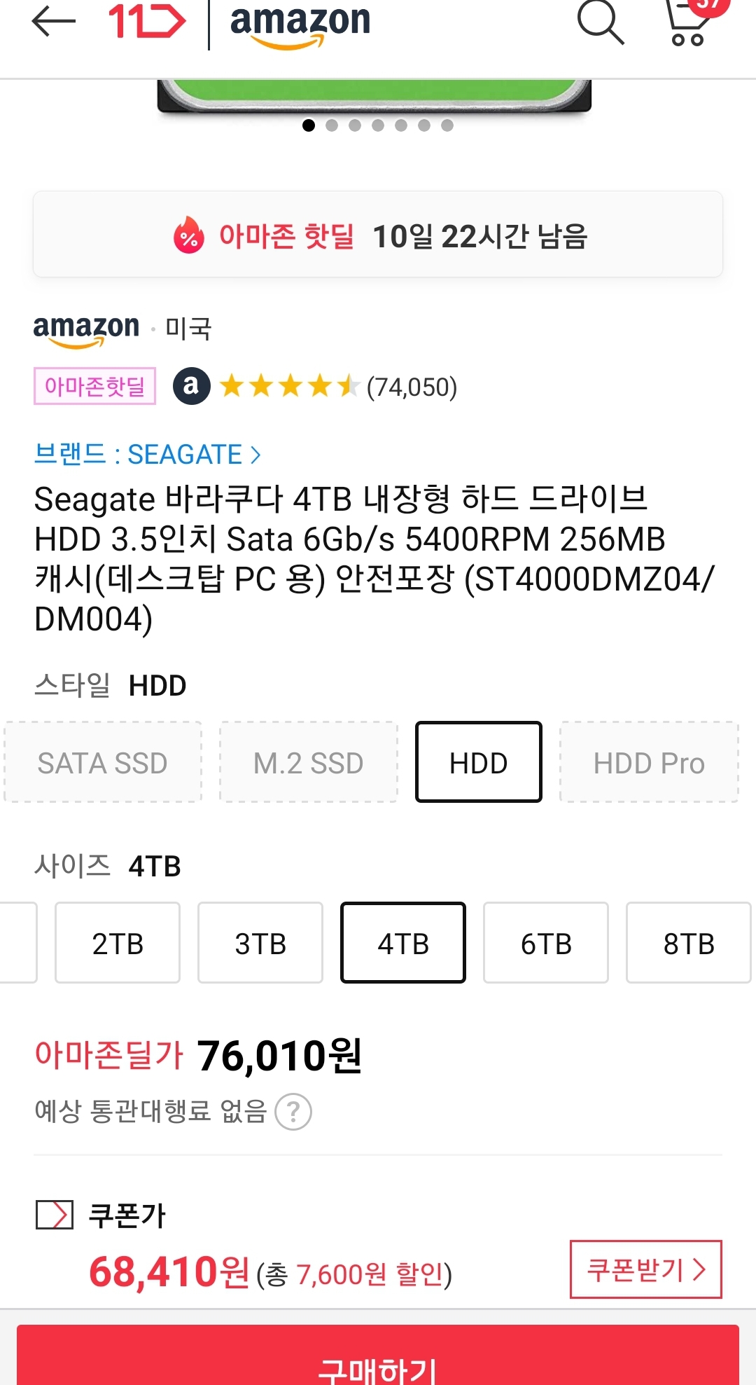 (11번가-아마존) 시게이트 4TB 5400RPM SMR HDD (~6.8만원/일반, ~6.3만원/우주패스) ST4000DMZ04/DM004 본문