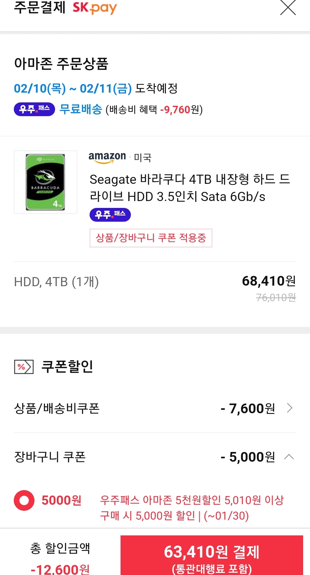 결제할 때 이것을 적용하면 6.8만원이고, 우주패스회원이라면 5천원 장바구니쿠폰을 쓰면 6.3만원이 나옵니다.
