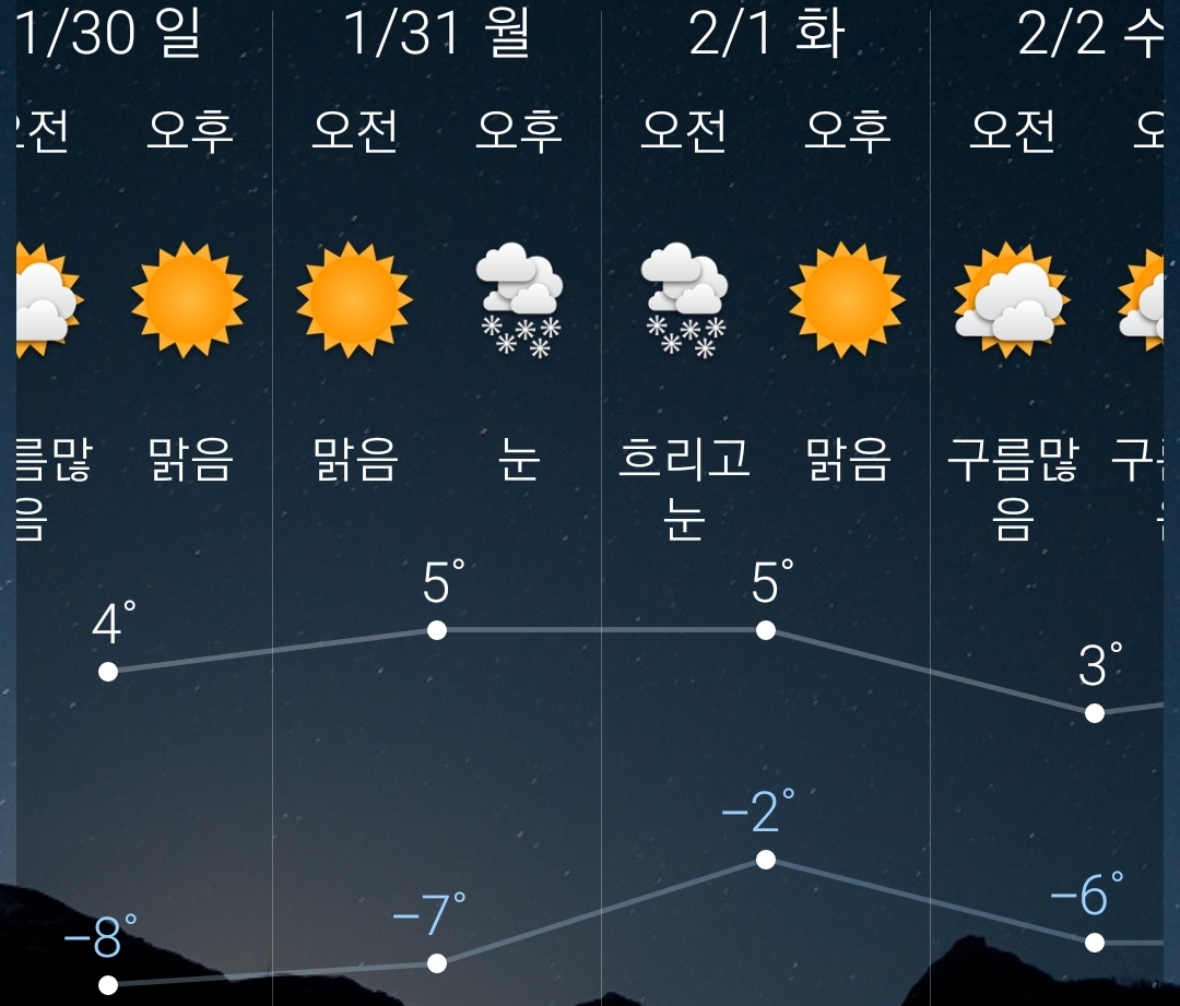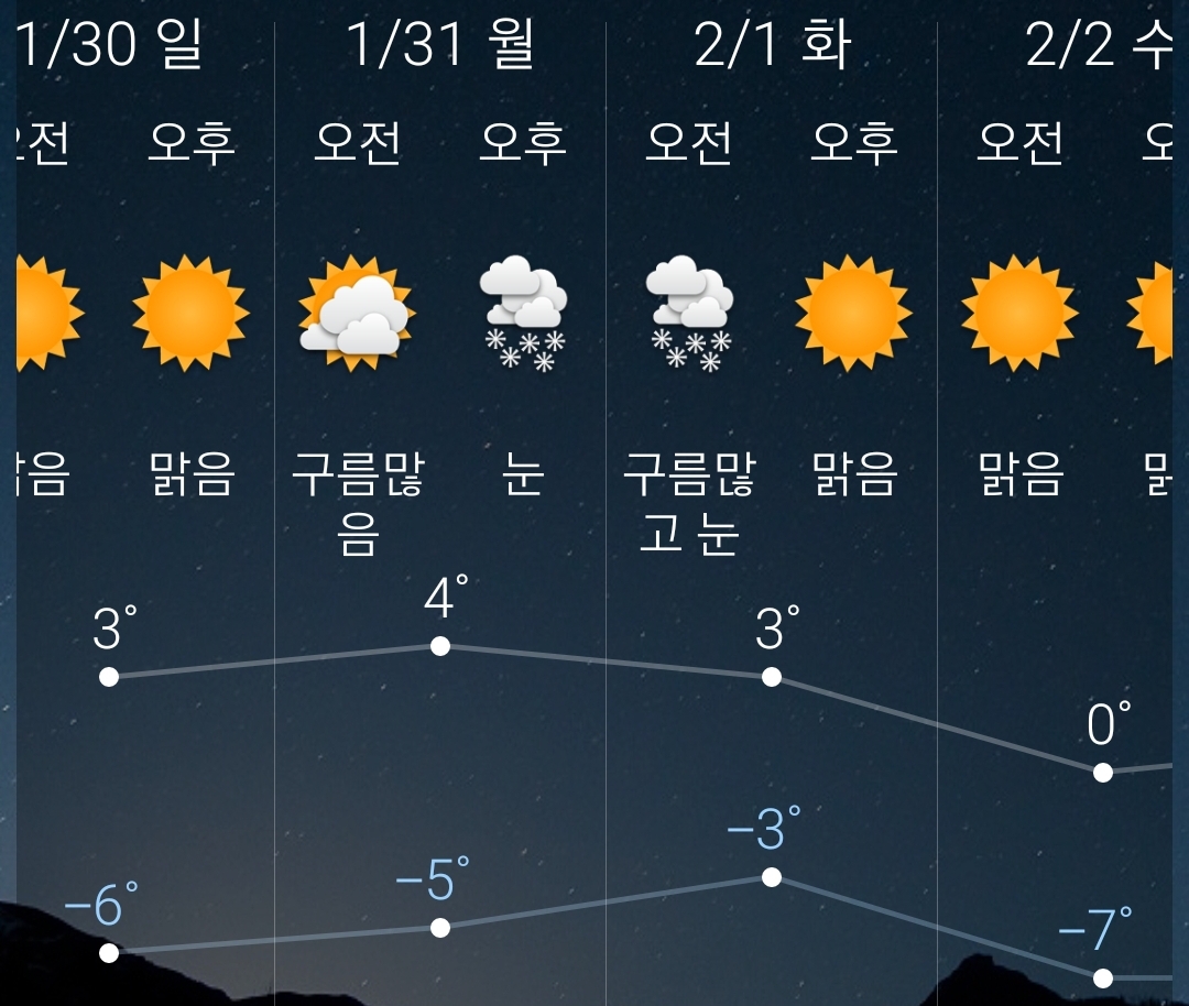 중기예보. 낮은 그럭저럭 영상이지만 바람불면 손시렵고, 밤은 그냥 겨울.