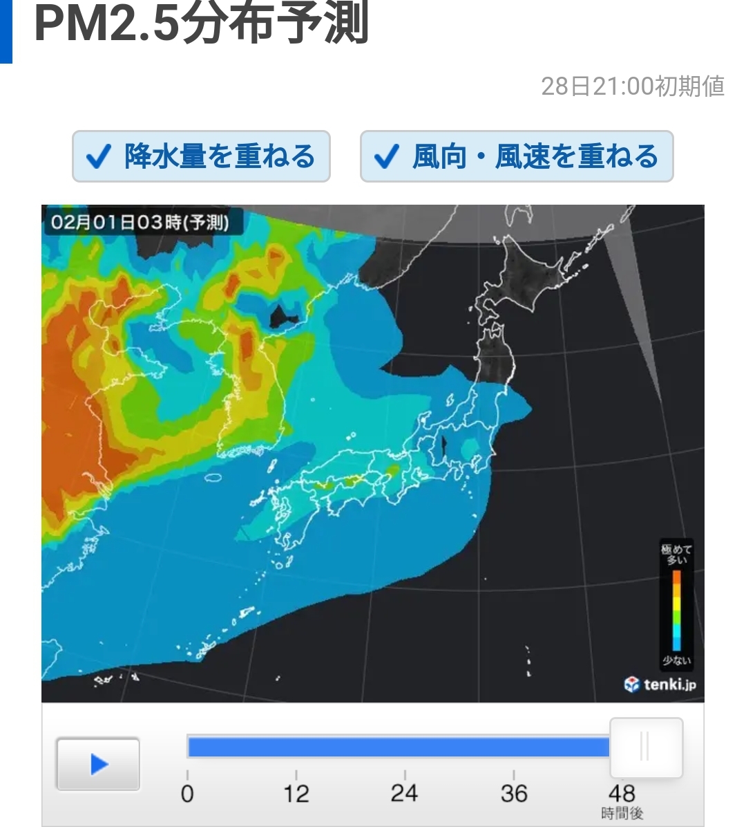 PM2.5予測情報では、健康への影響が懸念されるPM2.5(微小粒子状物質)の分布について、日本気象協会の独自気象予測モデルなどを用いて、現在から48時間先までの傾向を予測しています。