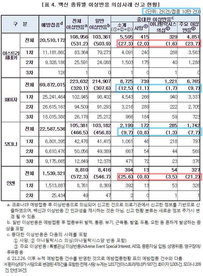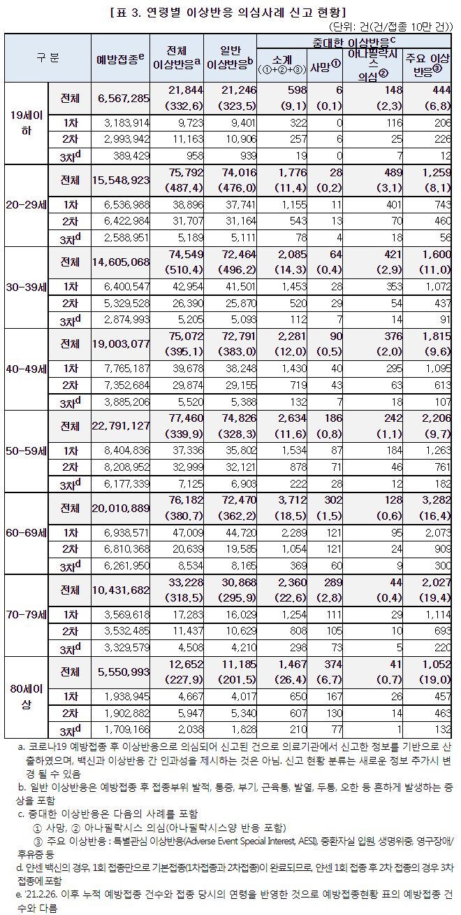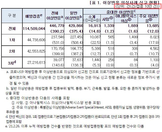 이것이 맨 앞 개요인데, 3차접종이 더 이상반응(부작용)확률이 적다는 부분에서, 그럴 수도 있기는 한데 어쩌면 보고가 적은 건 아니냐는 상상을 개인적으로 했습니다. 저나 제 가족, 주변사람들을 볼 때, 뒤로 갈수록 "이 주사는 아픈 게 당연하다"는 생각으로 참고, 의사말듣고 일반의약품먹고 신고를 안 했으니까요. 1차때는 대단했죠. 지금까지 맞은 예방주사하고는 전혀 다르게 아팠고 몸에 힘이 없으면서 몸살했고 며칠동안 갔고, 안면근육 일부가 가볍게 마비된 느낌을 느낀 분, 며칠간 아침마다 일어나보니 코피나있는 분도 있었으니까. 하지만 2차때는 다행이 마비나 코피났다는 분은 없었으니 덜하기는 한 모양이지만, 3차에 와서는 팔에 힘을 못 쓰고 아픈 기운이 몸 반신을 넘어가며 가슴이 찌릿한 정도는 예상한 것이었고 약먹고 버티는 게 상식이 됐고, 사실 다른 일로 문의해도 보건소는 전화도 안 되고 문자와서 설문조사사이트에 가도 뭐.. 이거 해서 뭐하냐는 생각에 닫아버렸을 정도니까요. 어쨌든 다들 살아남았습니다.