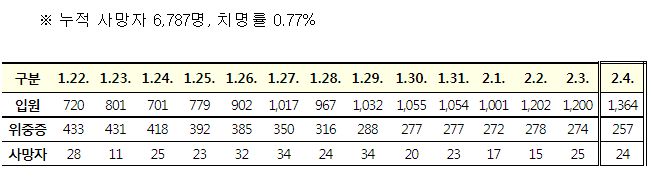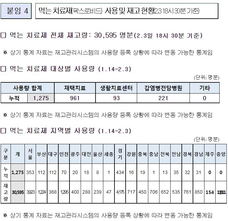 ㅡ 팍스로비드, 고위험군(고령자와 기저질환자) 환자위주로 투약 점진 확대. (2월 3일까지는 1275명분 사용)
