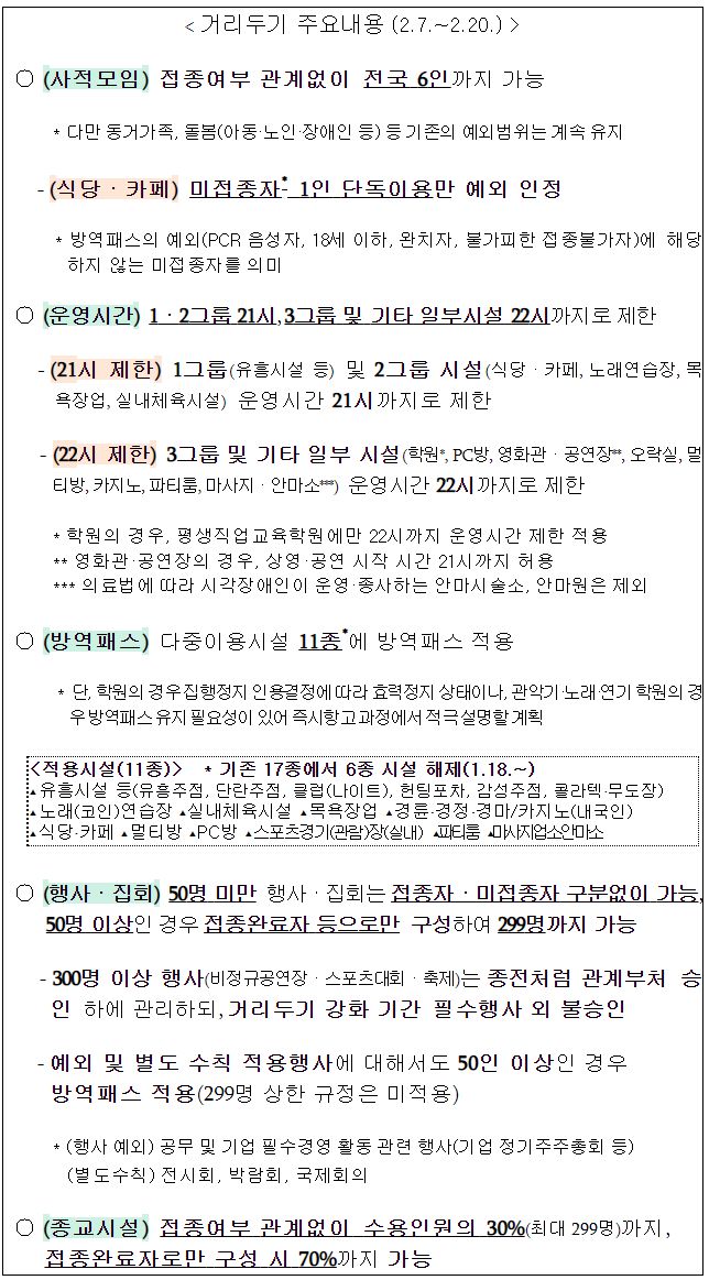 코로나19(2022.2.4) 보도자료: 관리정책변경, 유행상황과 전망/:/ 거리두기 2월 20일까지 연장, 방역패스 적용시설과 수칙 등 본문