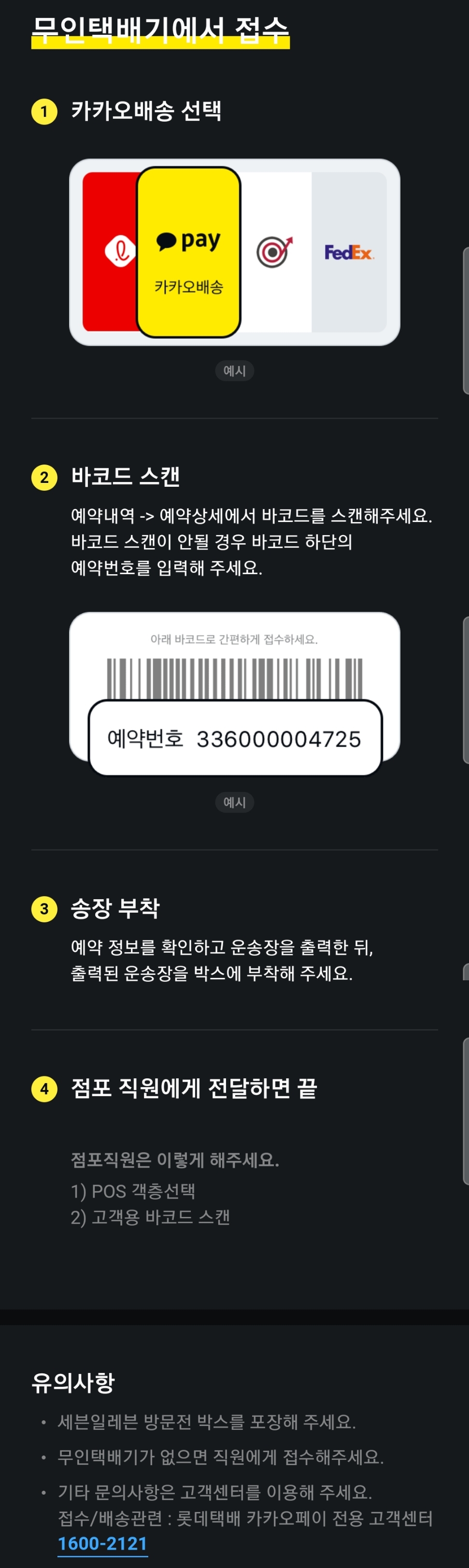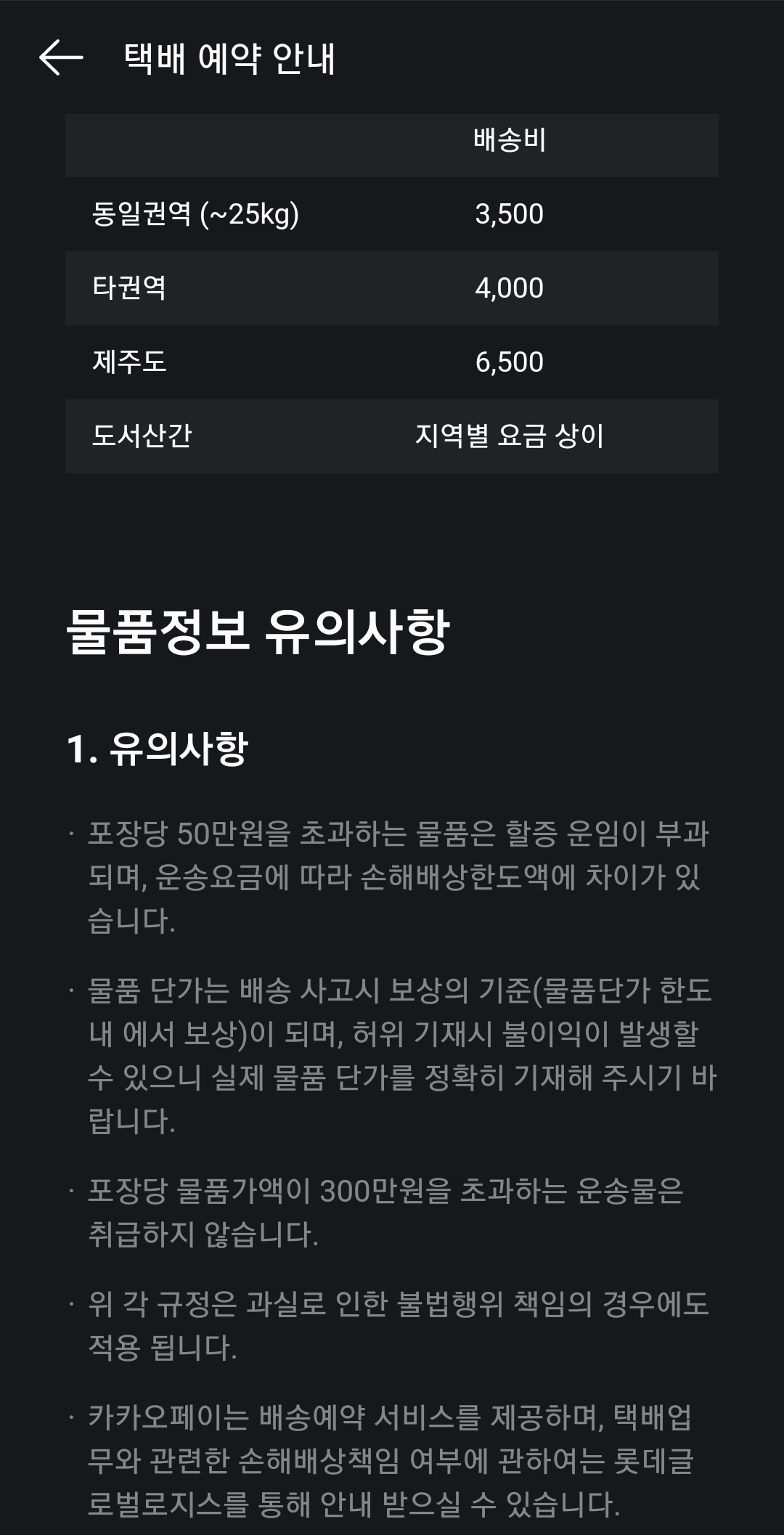 카카오톡페이 앱을 이용한 예약. 중량무관이라지만 아마 다른 회사 대형택배기준이 아닐까 생각했는데, 아래 설명보면 160센티 25kg으로 다른 회사대비 여유가 있습니다.