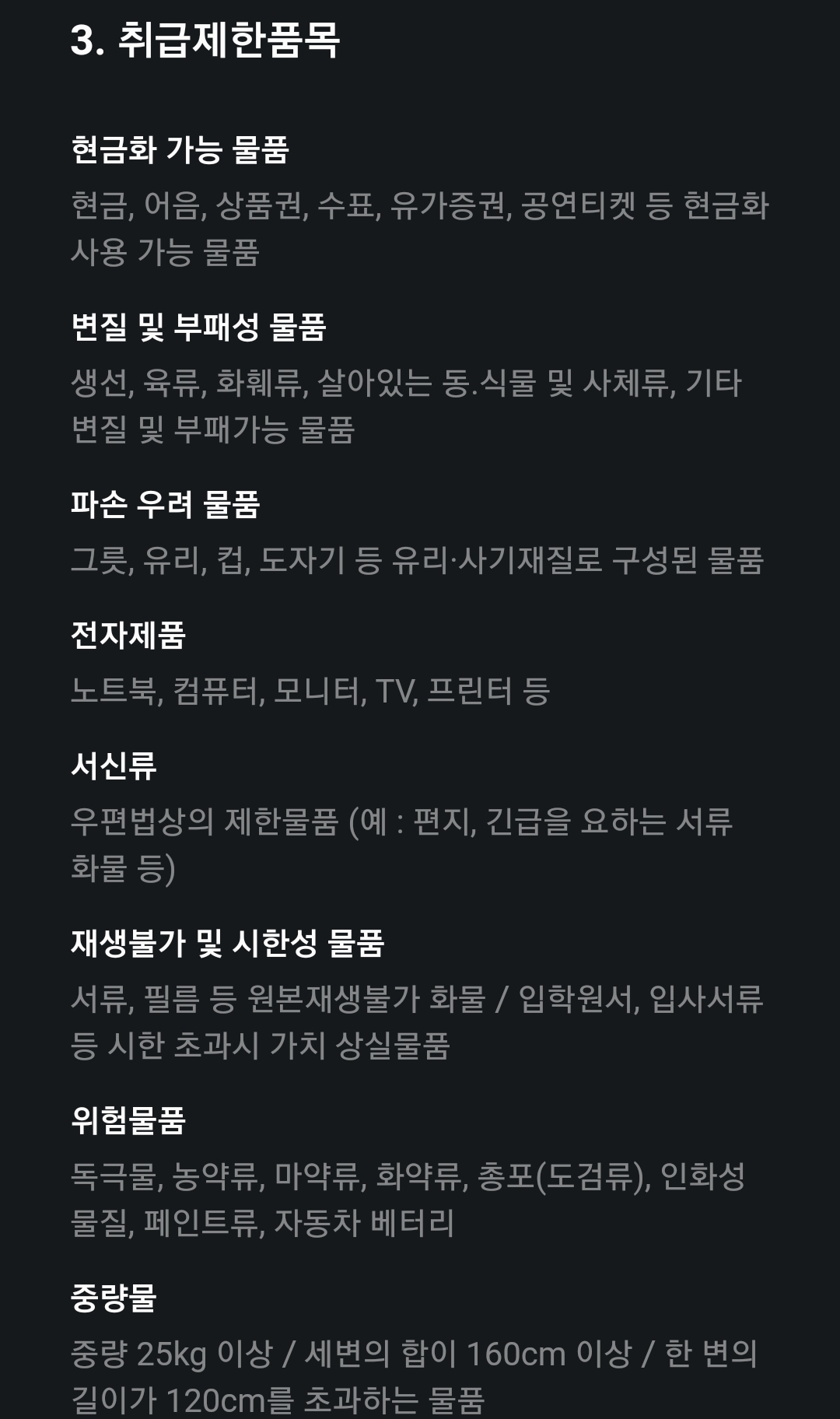 카카오톡페이 앱을 이용한 예약. 중량무관이라지만 아마 다른 회사 대형택배기준이 아닐까 생각했는데, 아래 설명보면 160센티 25kg으로 다른 회사대비 여유가 있습니다.