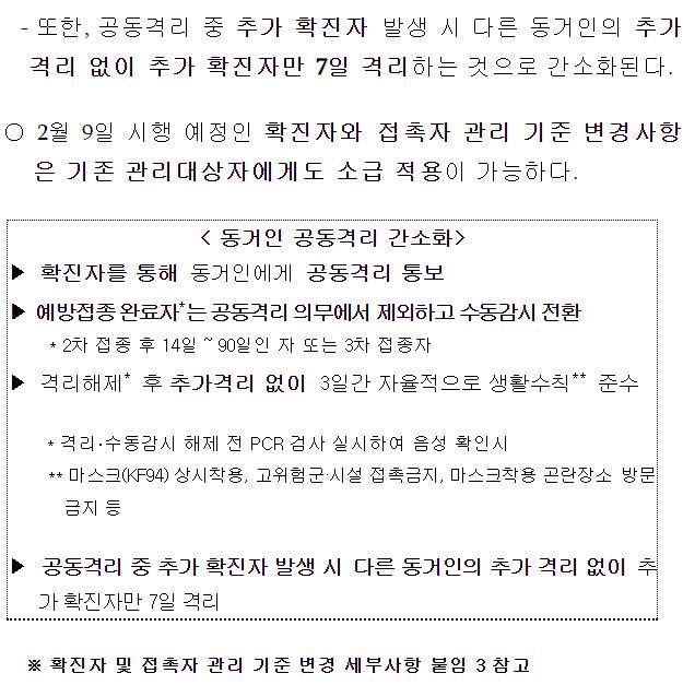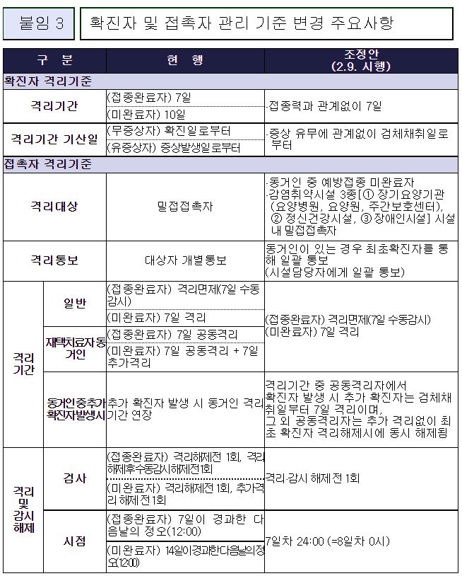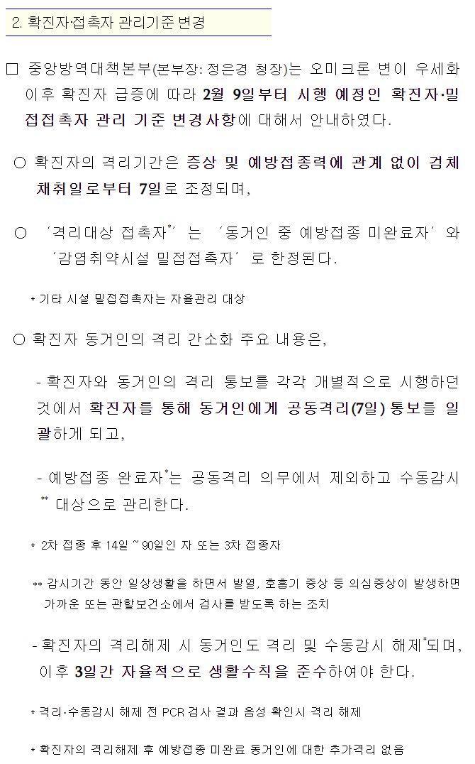 | 코로나19(2022.2.9) 확진자 및 접촉자 관리 기준(격리기준) 변경 (0) | 2022.02.09 |