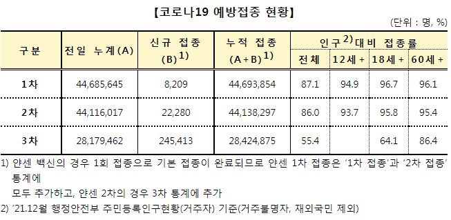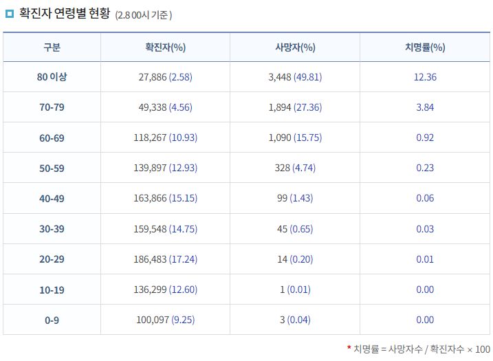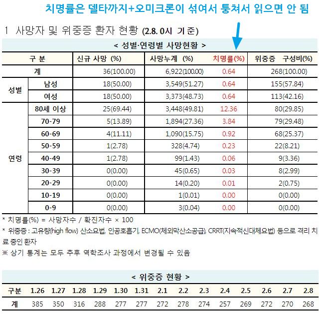 다른 표에는 전부터 들어갔지만 이 표에는 안 써주던 걸 빨강색으로 강조해서 추가해줬군요. 아마.. 잘 보고 '3월달부터 독감취급하는 걸 검토하겠다'는 발표가 지난주말에 나왔으니, 그걸 할 생각으로 보도자료를 바꾸는 모양입니다. 뭐, 저기 써놓은 치명률만 보면 사실, 장년층이하나 청소년은 예방접종맞을 필요가 있나 싶을 정도죠..