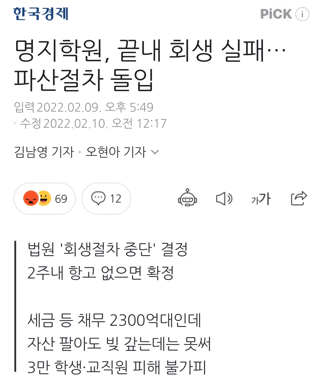 명지학원(명지대학교 등)이 파산할지도 모른다는 기사 본문